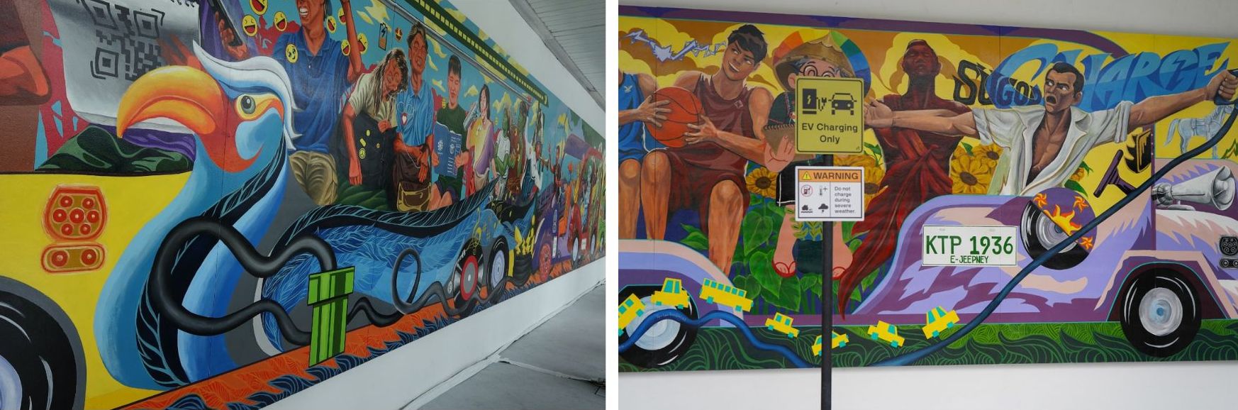 To emphasize the message of sustainability and the transformative role of electrified mobility in fostering a cleaner environment, the U.P. Town EV Charging Hub is adorned with a stunning mural by Professor Toym Imao and his team of talented students from the College of Fine Arts of the University of the Philippines. Embodying the battle cry of “charging forward,” this centerpiece captures both the spirit of progress and innovation while celebrating Katipunan Avenue’s vibrant stories and history.