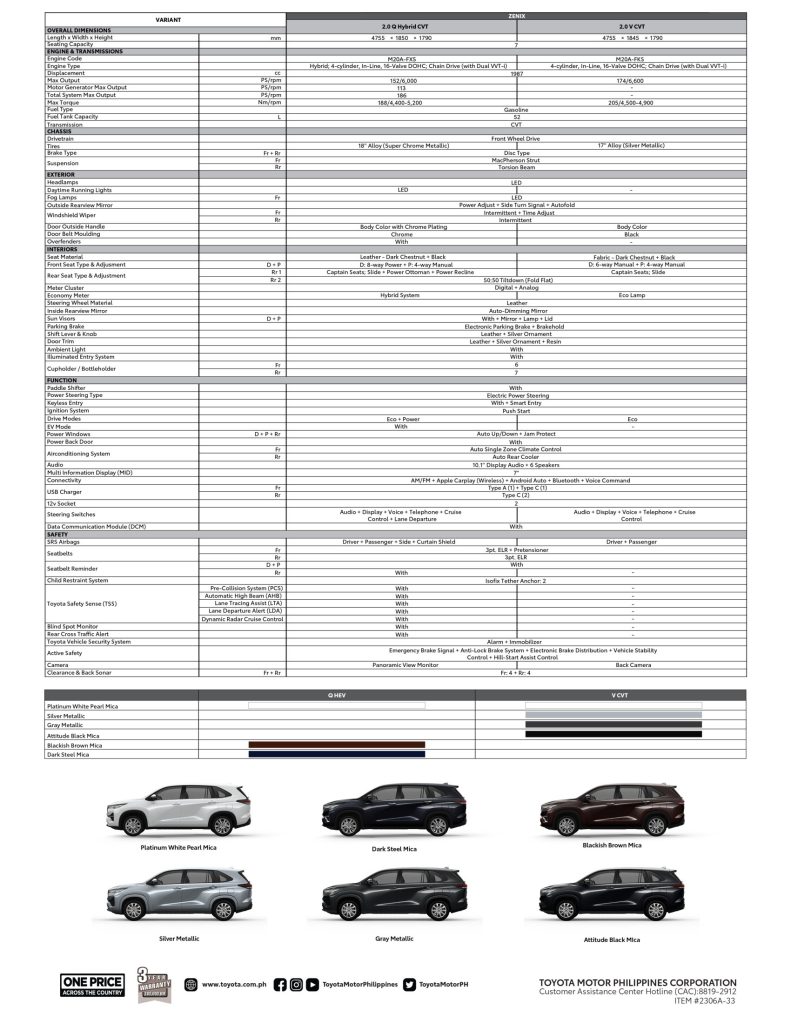 The all-new Zenix is now available in all 72 Toyota dealerships nationwide at a starting price of PHP 1,953,000 for the 2.0 Q Hybrid CVT and PHP 1,670,000 for the 2.0 V CVT. The HEV variant comes in Platinum White Pearl Mica, Blackish Brown Mica, and Dark Steel Mica, while the gas variant is available in Platinum White Pearl Mica, Silver Metallic, Gray Metallic, and Attitude Black Mica.