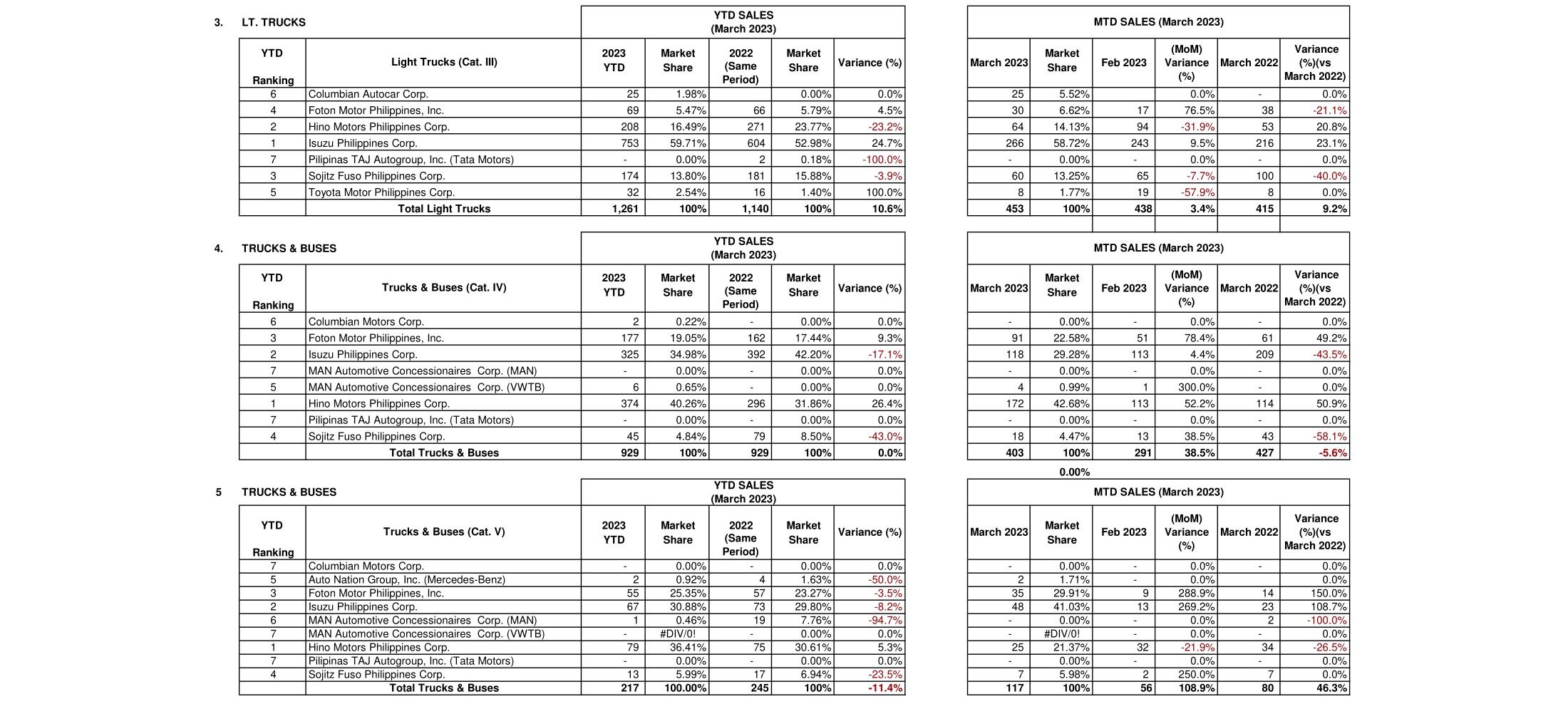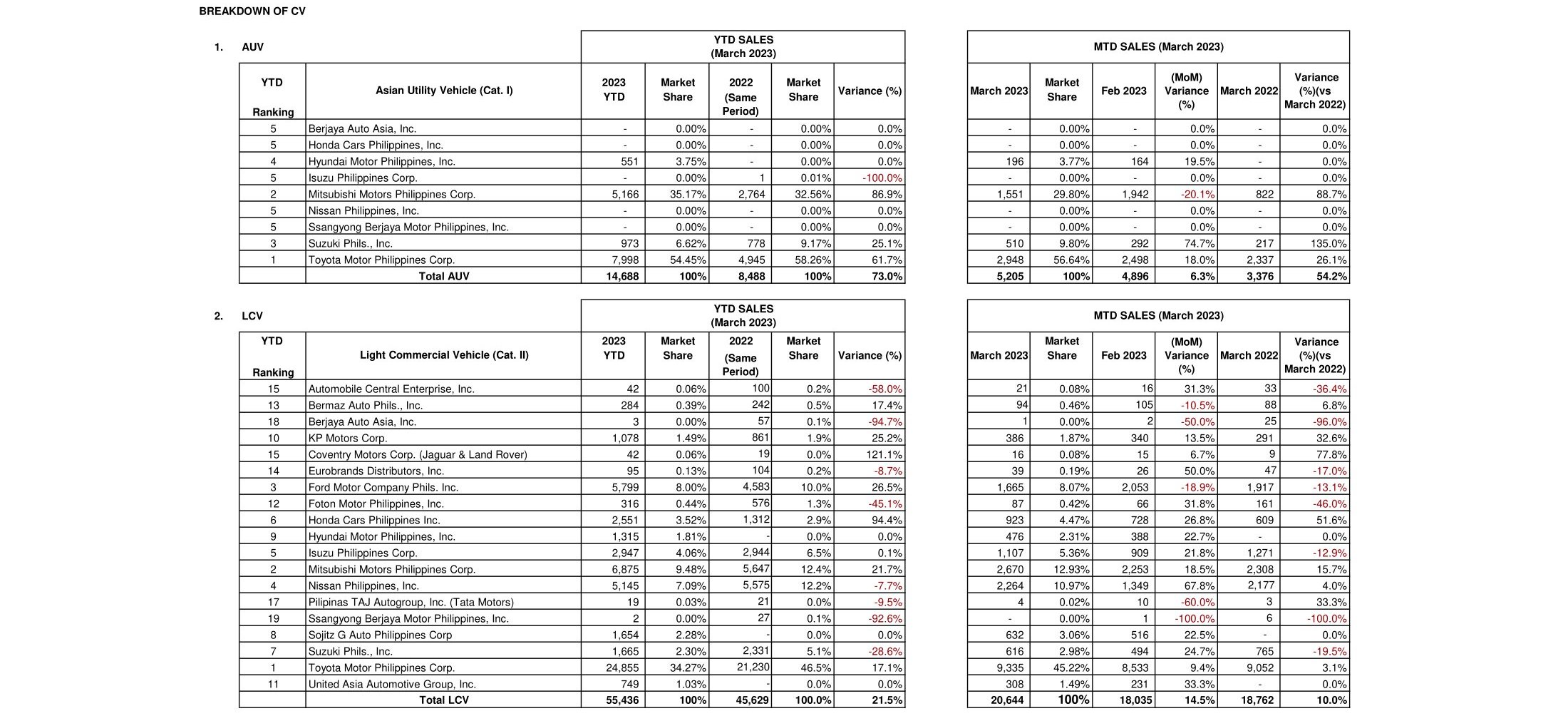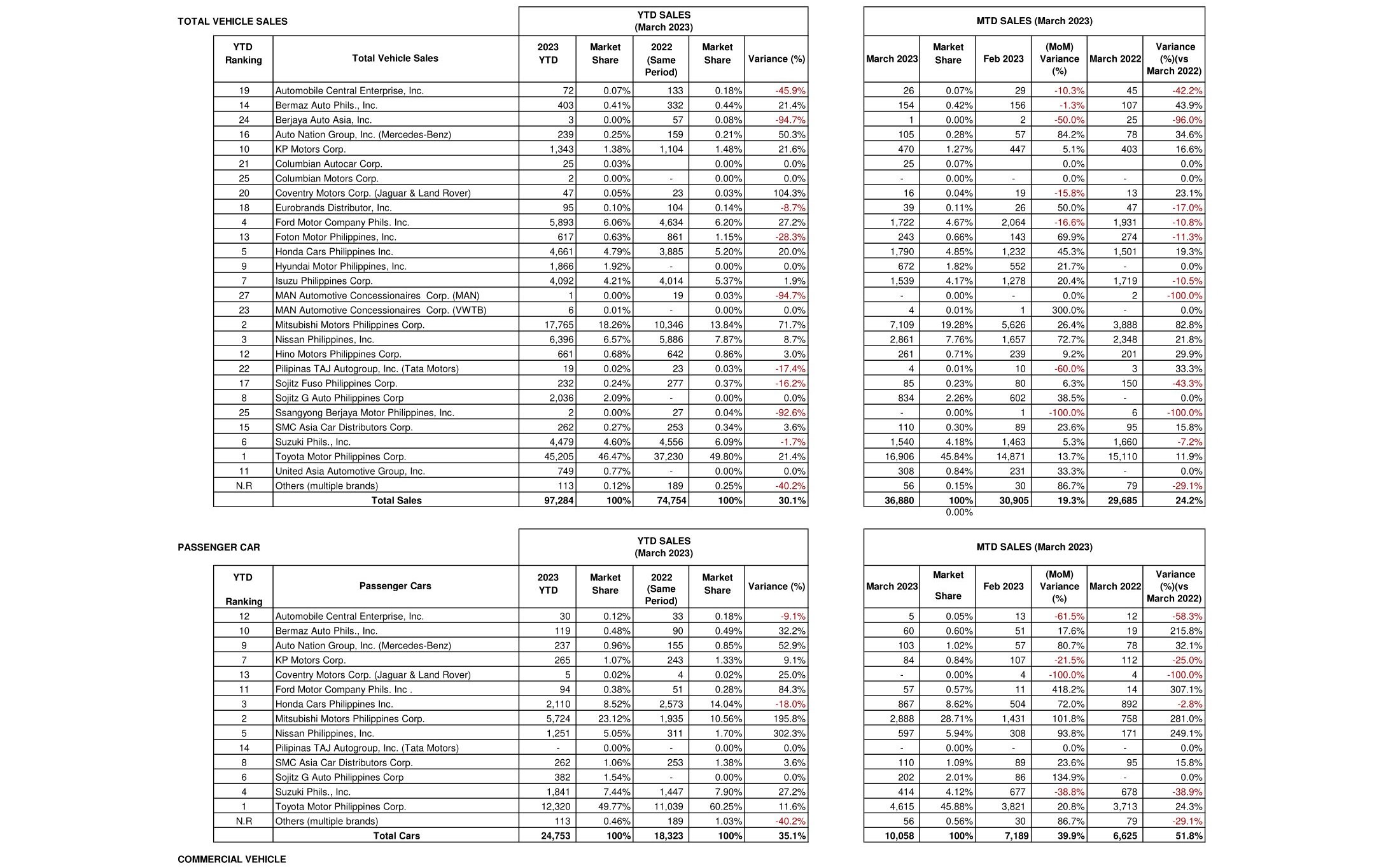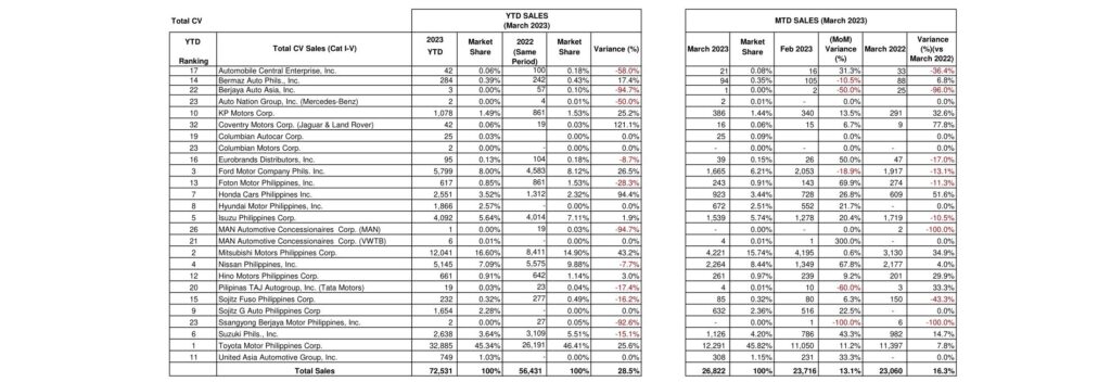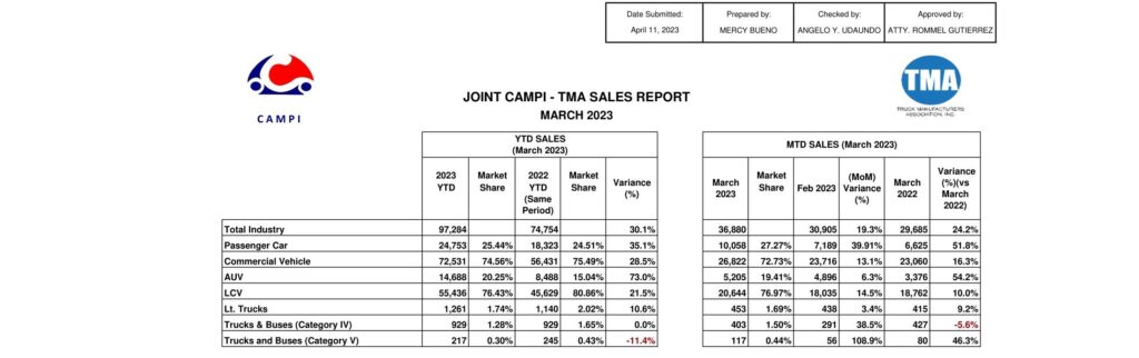 A joint report by the Chamber of Automotive Manufacturers of the Philippines, Inc. (CAMPI) and Truck Manufacturers Association (TMA) shows total new motor vehicle sales for March 2023 reached 36,880 units, equivalent to 24.2% increase compared with 29,685 units recorded in the same period a year ago.