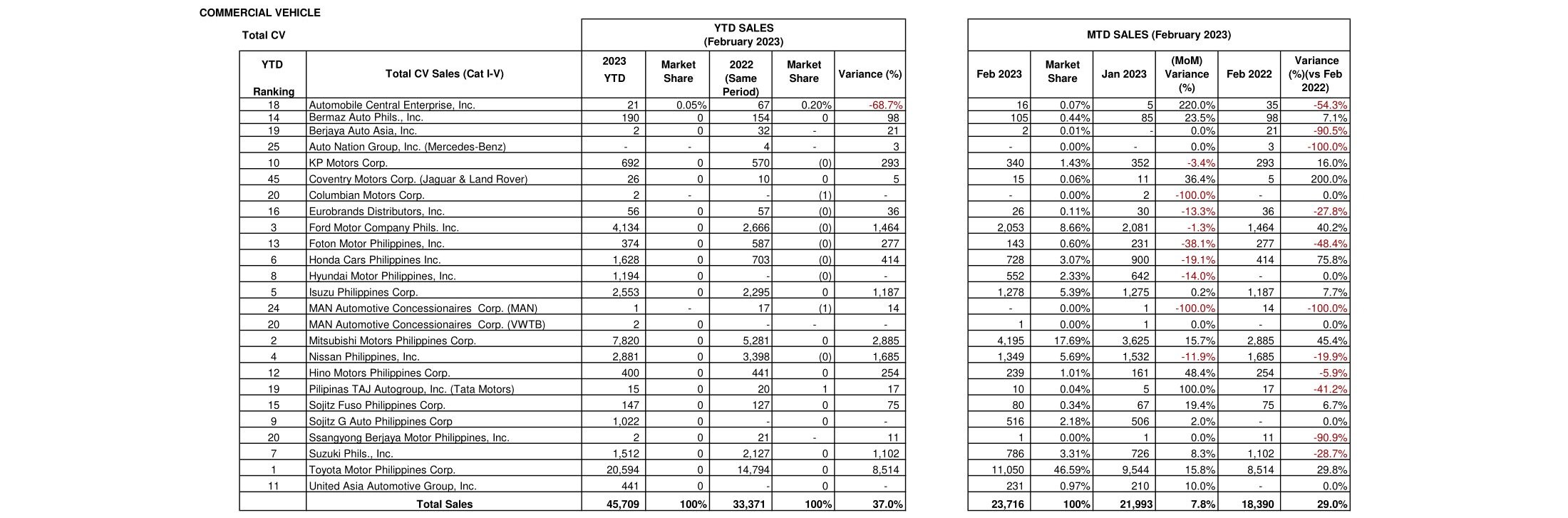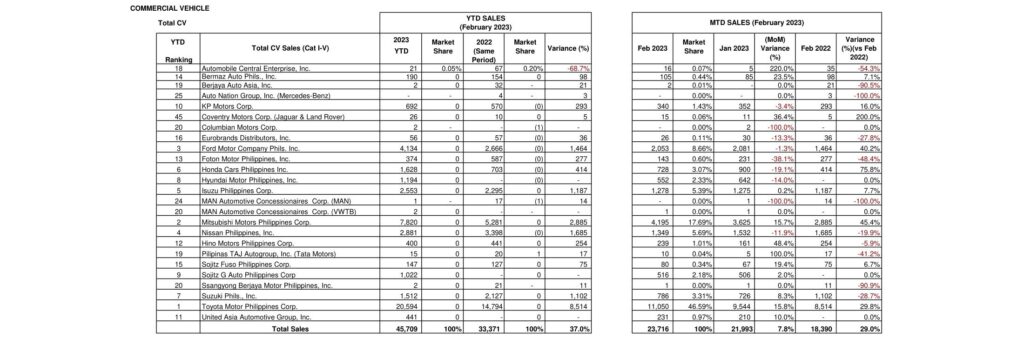 A joint report by the Chamber of Automotive Manufacturers of the Philippines, Inc. (CAMPI) and Truck Manufacturers Association (TMA) shows total new motor vehicle sales for February 2023 reached 30,905 units, equivalent to 27.2% increase compared with 24,304 units recorded in the same period a year ago.