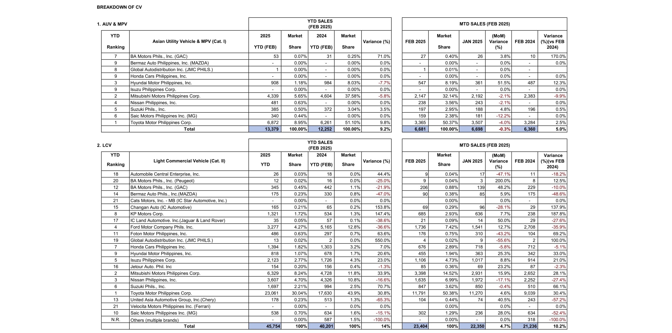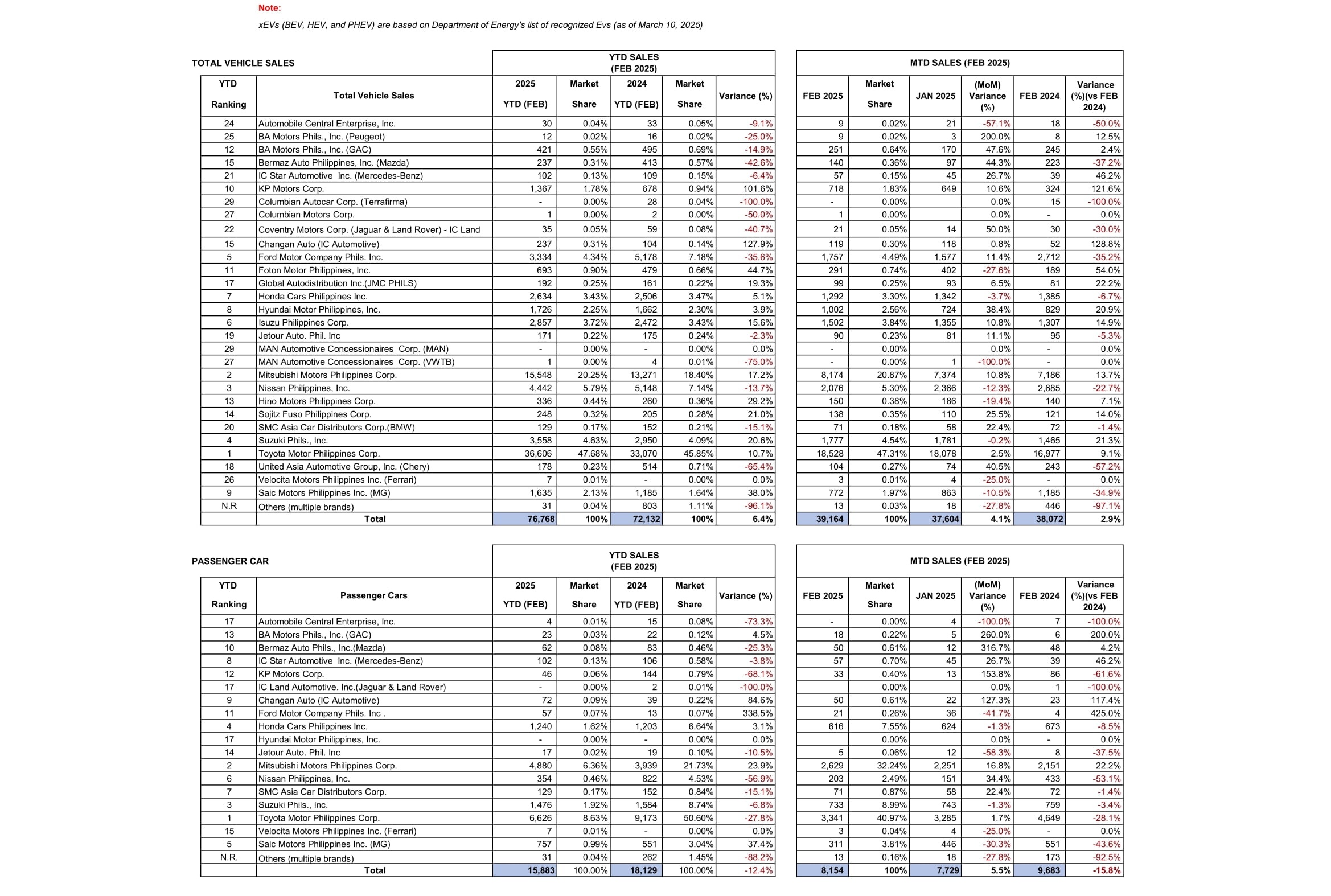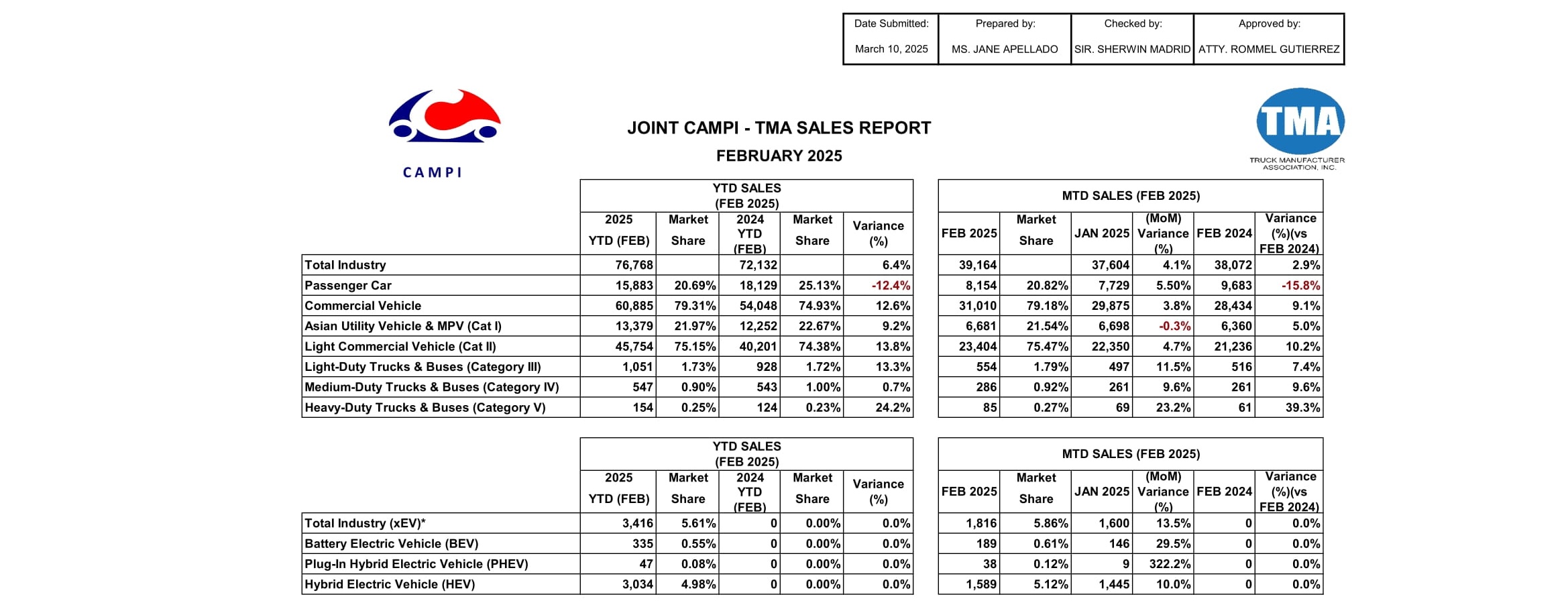 A joint report by the Chamber of Automotive Manufacturers of the Philippines, Inc. (CAMPI) and the Truck Manufacturers Association (TMA) showed the industry sales data for February 2025 reveals that Year-to-Date (YTD) sales have shown an overall positive trend with a total of 76,768 units, marking a 6.4% increase from the previous year’s 72,132 units.