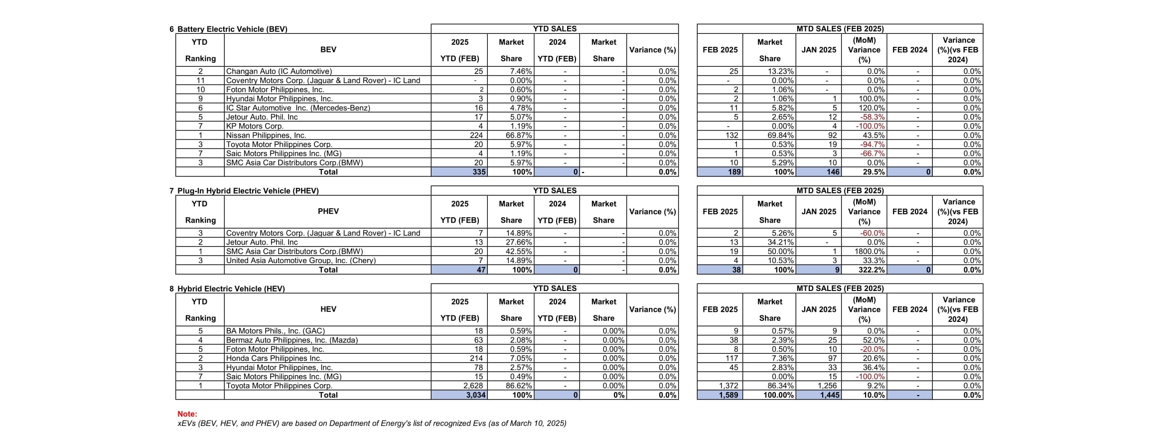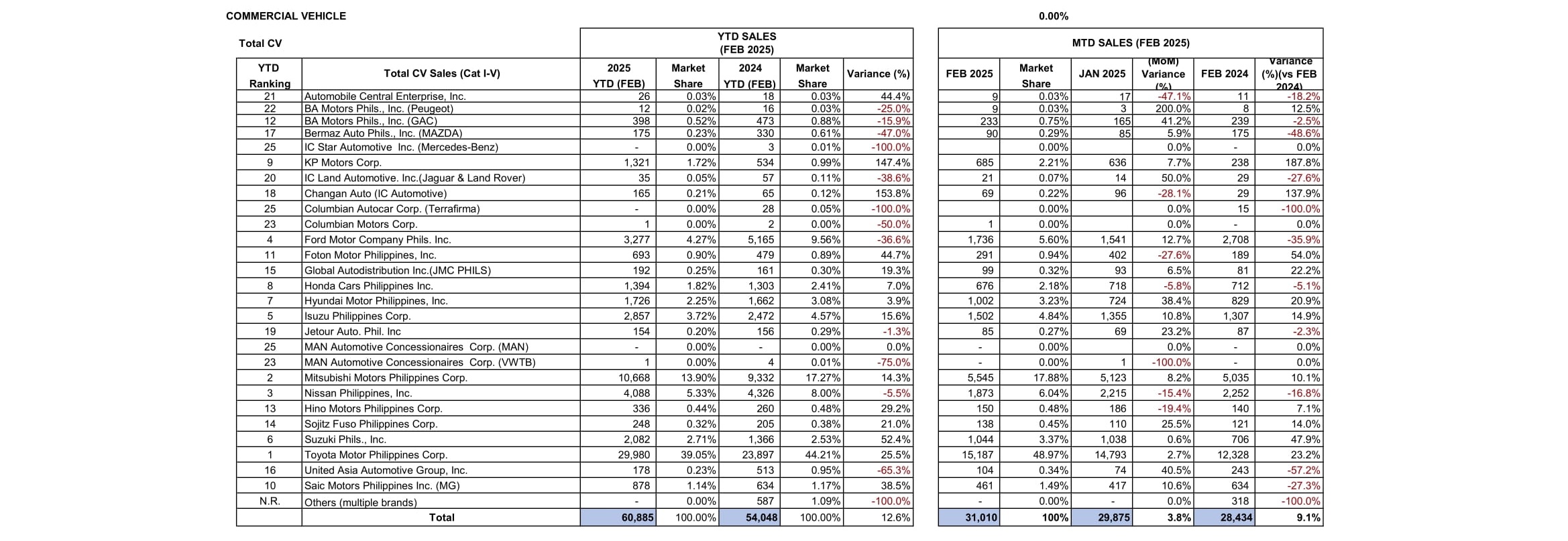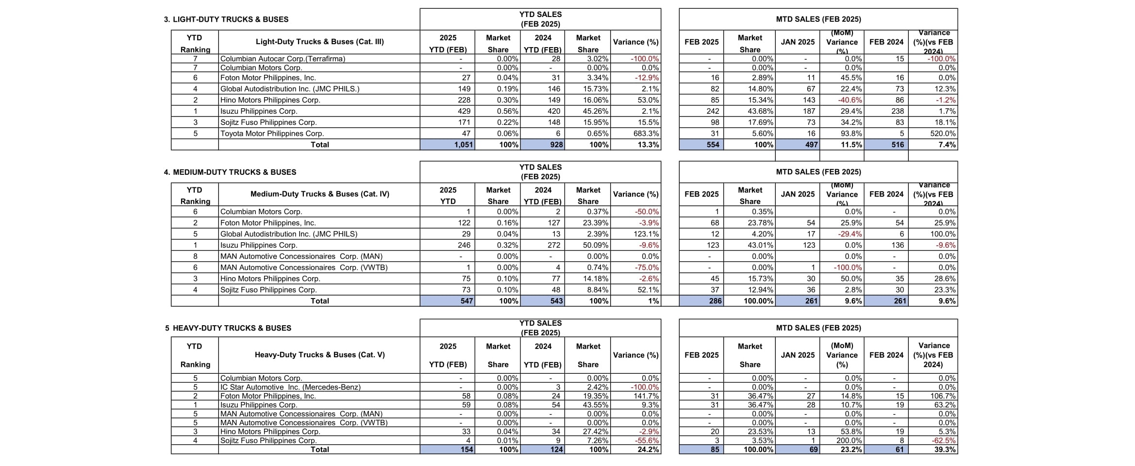 A joint report by the Chamber of Automotive Manufacturers of the Philippines, Inc. (CAMPI) and the Truck Manufacturers Association (TMA) showed the industry sales data for February 2025 reveals that Year-to-Date (YTD) sales have shown an overall positive trend with a total of 76,768 units, marking a 6.4% increase from the previous year’s 72,132 units.