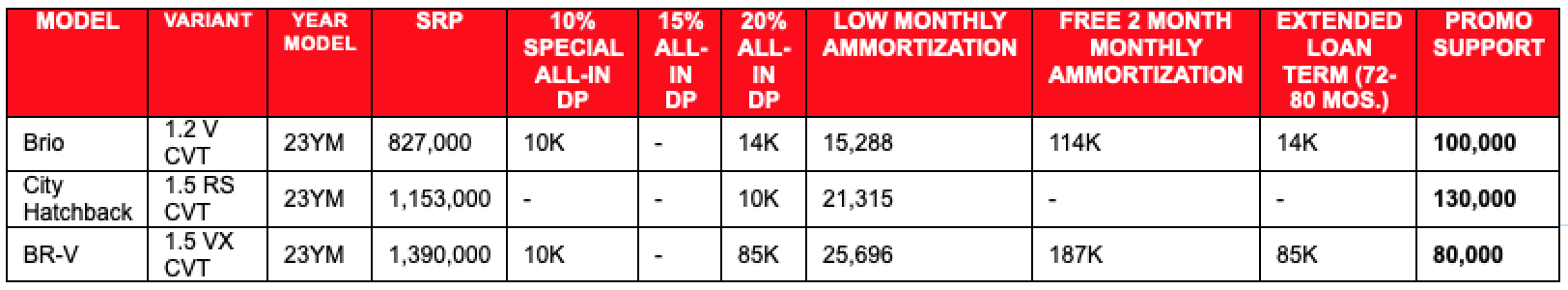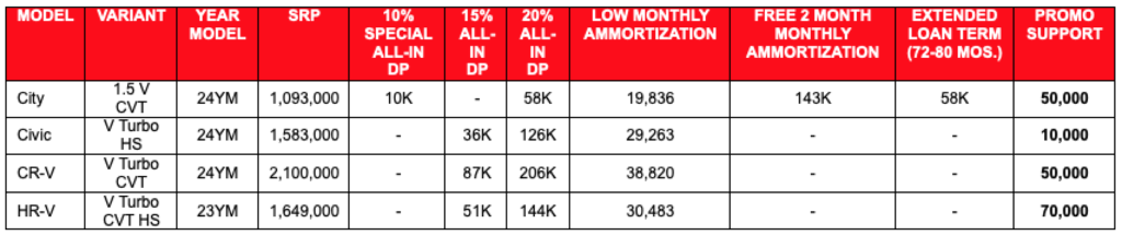 Honda is offering cash promos and flexible financing offers with all-in low cash out scheme available at 10%, 15%, and 20% downpayment, and low monthly amortization options. Now, you can hit the road with the Brio V for as low as PHP 727,000, and a downpayment option for as low as PHP 10,000, while you can get the City Hatchback RS for as low as PHP 1,023,000 through its PHP130,000 cash promo.
