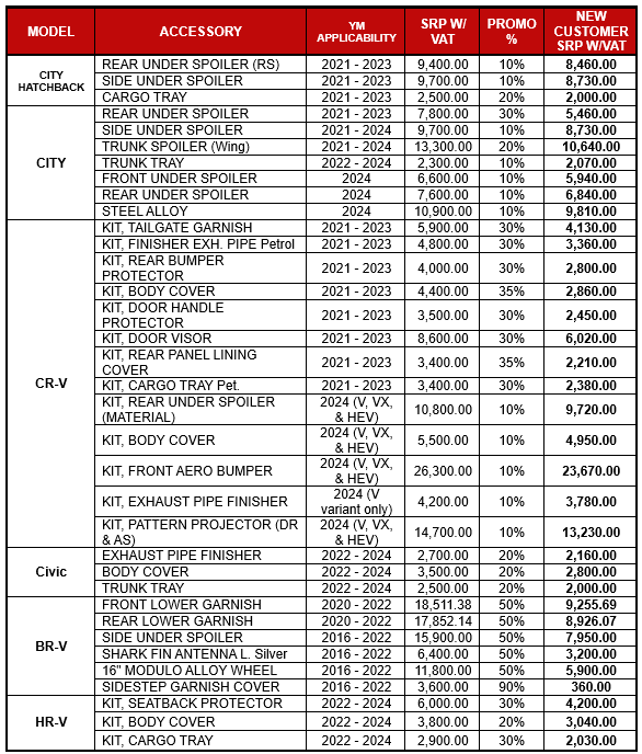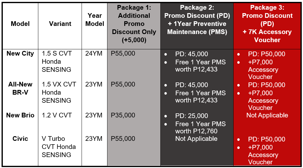 Customers interested to avail a brand-new All-New BR-V, New Brio, New City, and New Civic, will have an option to choose at least one (1) promo package suitable to their needs care of Honda. Avail a free one (1) year Periodic Maintenance Schedule or an accessory voucher upon the release of the vehicle. This promo can be used on top of on-going promos. Below is the table of packages available: