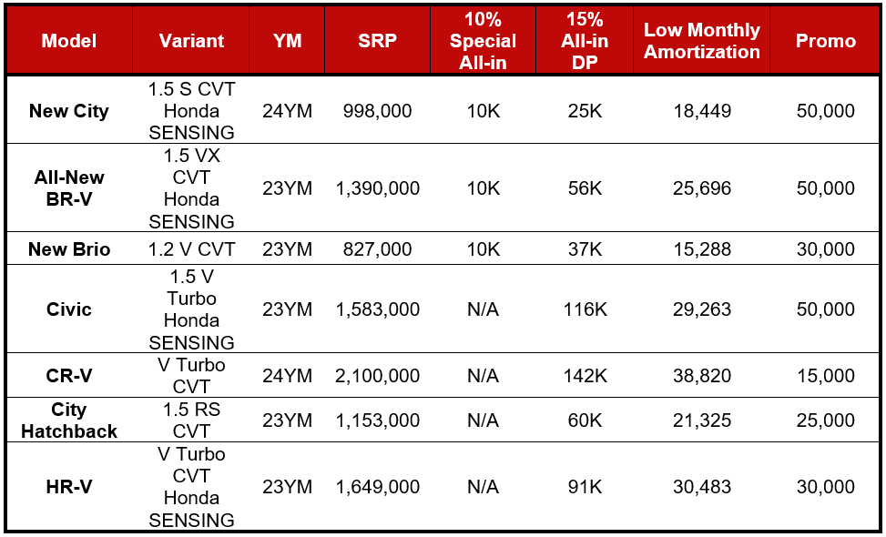 To continue giving only the best value to everyone, Honda is offering a Low Cash-Out and Low Monthly Amortization All-In Bundle with payment terms for as low as 15% and 20% downpayment payable for 36 to 60 months. Meanwhile, a Special All-In Downpayment for customers interested to purchase a Honda with a 10% downpayment payable for 36 to 60 months applicable through BPI, RCBC, China Bank Savings, and Bank of Commerce for specific models and variants but is subject to further bank approval. A free insurance package is available through RCBC, China Bank Savings, Maybank, and BDO with a minimum financed amount of PHP 500,000.