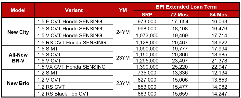 In partnership with BPI, HCPI is offering an extended loan term on Honda’s best-selling models payable up to 72 to 84 months available for the All-New BR-V, New Brio, and New City.