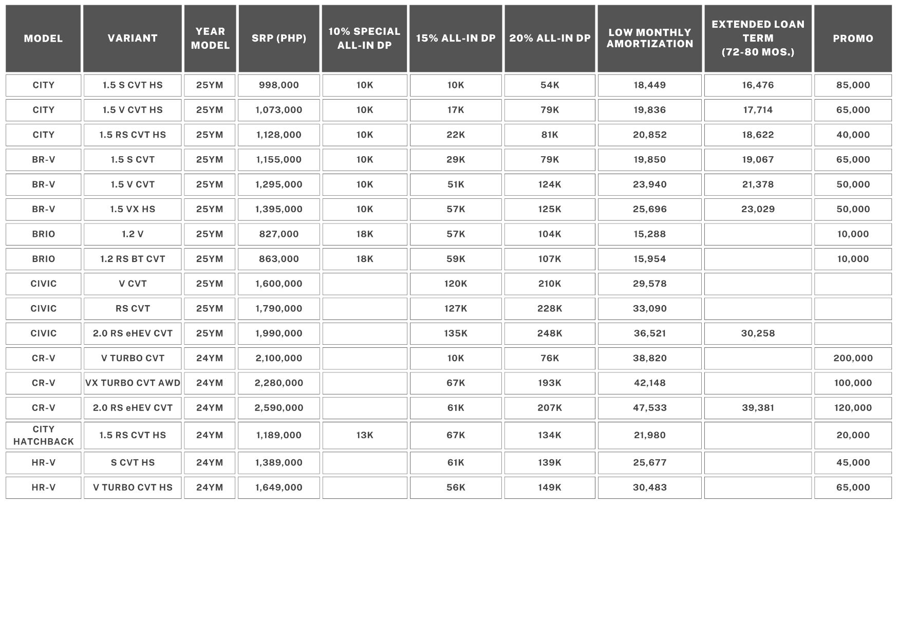 - Low Cash-out and Low Monthly Amortization All-In Bundle applicable for current e:HEV models: Customers are entitled to 15% or 20% downpayment for 36 to 60 months. Moreover, discounts can be applied to lower the downpayment. Fifteen Percent (15%) downpayment is not applicable to PSBank. This is subject to bank approval.