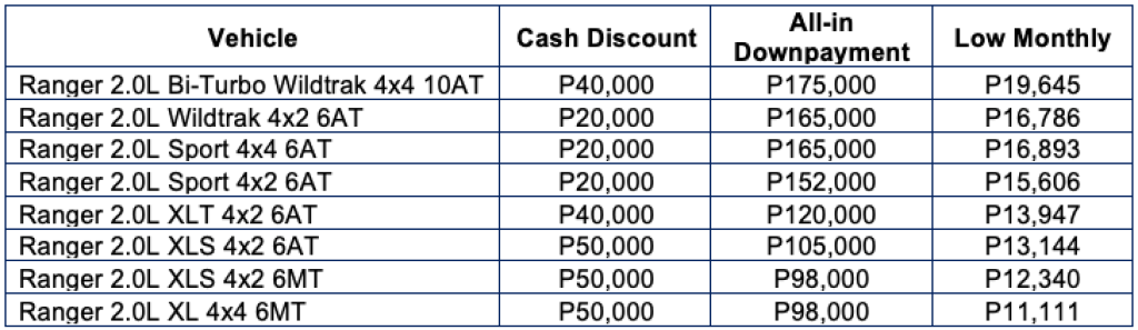 Customers can get as much as P50,000 cash discount with a purchase of a Ford Ranger. They can also avail of an all-in low downpayment of P98,000 or a low monthly payment of P11,111.