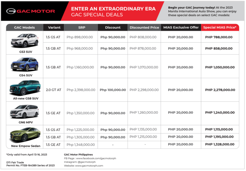 Visit www.gacmotorph.com for updates and details. 1 DTI Fair Trade Permit No. FTEB-164389 Series of 2023