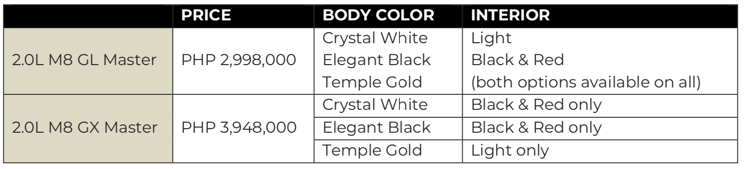 The GAC M8 MPV will be offered in two variants at the following price points and color options: