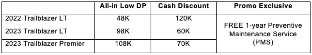 This Chevrolet compact SUV can land on your garage with FREE 1-year PMS for as low as P48K All-In Low Down Payment or as much as P120K Cash Discount. See the promo range below: