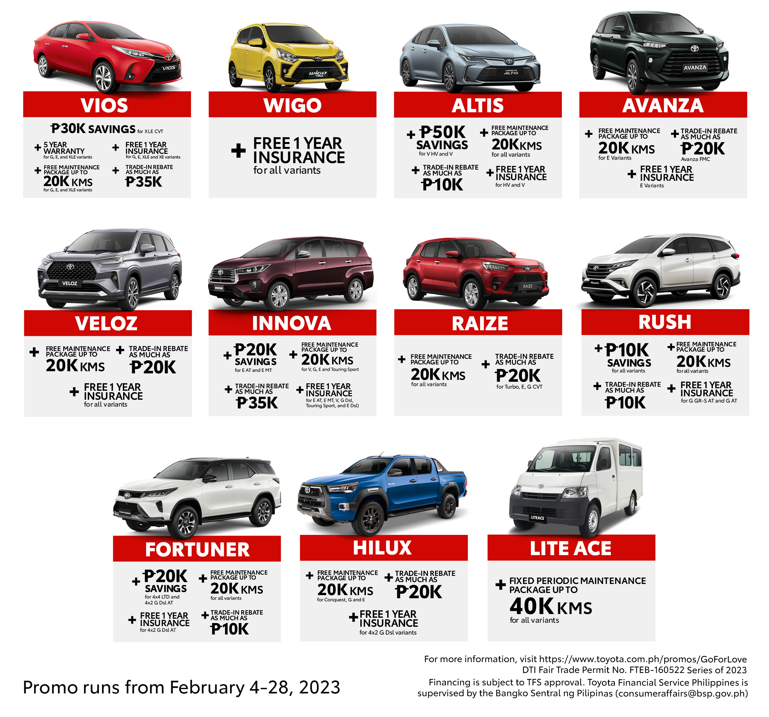 All brand-new Wigo, Veloz, and select variants of the Vios, Corolla Altis, Innova, Hilux, Avanza, Rush, and Fortuner purchased during the promo duration are covered by a FREE one-year comprehensive insurance provided by Toyota Insure.