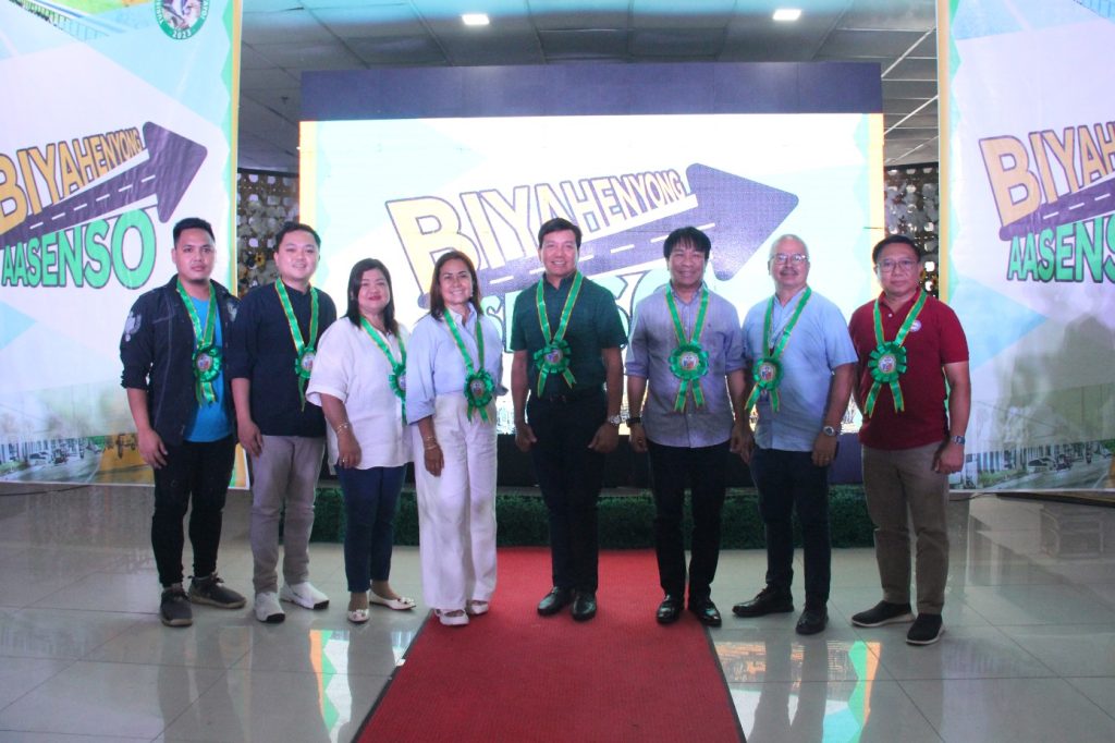 Government and private sector leaders join hands to push for safer, more comfortable, and sustainable commuting at Biyahenyong Aasenso: (L-R) from the Lumban Mayor’s office, Mr. Jobo Añonuevo; Pagsanjan Administrator Gabby Areza; Mrs. Lolita Areza; HARI President and CEO Maria Fe Perez-Agudo; Pagsanjan Mayor Cesar Areza; DOTR Undersecretary James Andres Melad; Majayjay Mayor Romeo Amorado; and LTFRB Region 4A Director Renwick Rutaquio.
