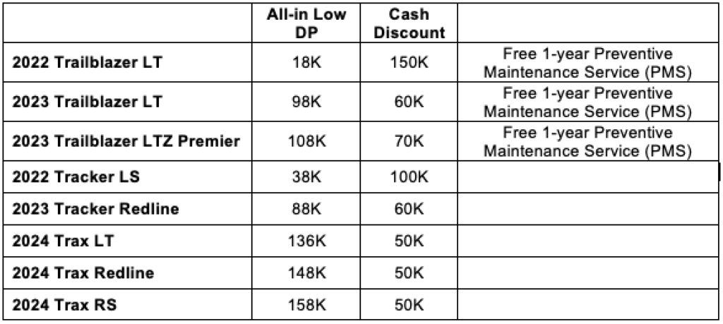Promo runs until December 31, 2023. Per DTI Fair Trade Permit No. FTEB- 79908 Series of 2023. For full mechanics of the promo, visit www.chevrolet.com.ph/offers.