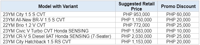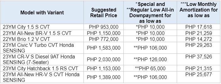 The Honda summer promo offers special all-in financing program applicable for a 10% downpayment with 36-60 months payment terms for select models: