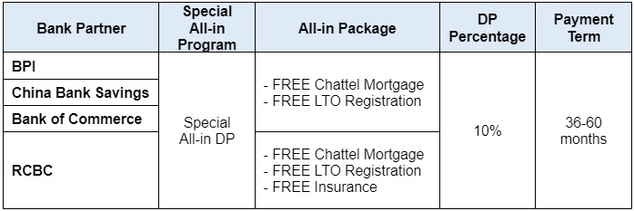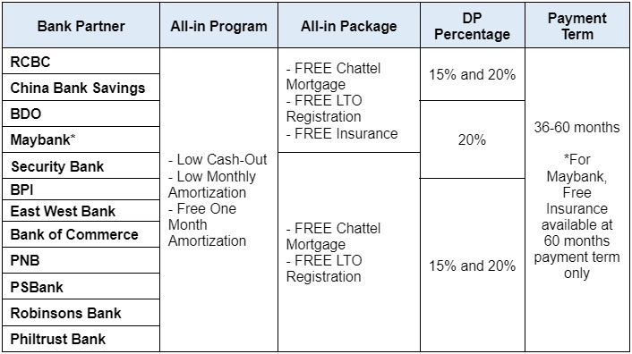 Customers are also entitled to neat financing promo offers such as low cash-out, low monthly amortization, free one (1) month amortization at 15%, and 20% all-in downpayment offers, available with the following bank partners: