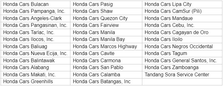 To know more about the Summer-Ready Promo, visit www.hondaphil.com Virtual Showroom After Sales or inquire with the participating Honda dealers and service centers nationwide: