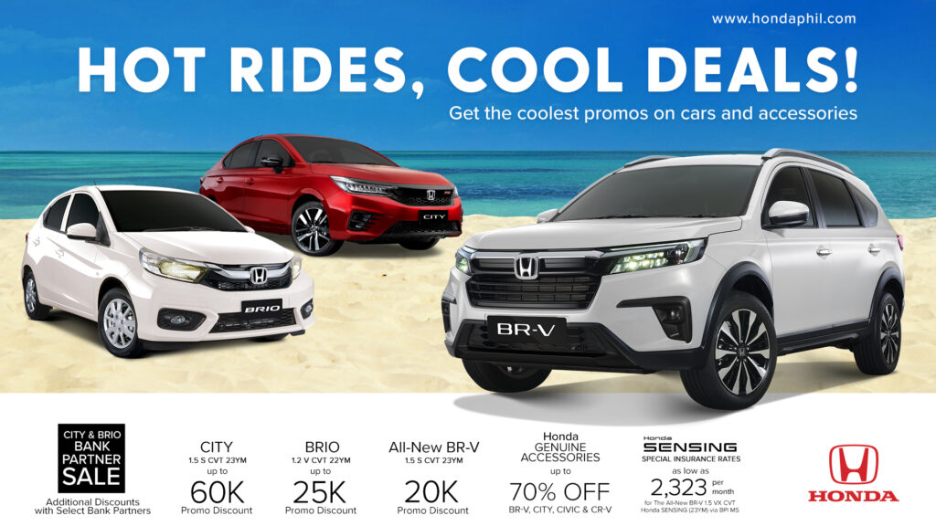 Honda Cars Philippines, Inc. (HCPI) provides the motoring public with more reasons to enjoy the summer season with the “Hot Rides, Cool Deals” promo. Extended until May 31, 2023, interested customers may avail of special offers and exclusive deals on their favorite Honda such as the All-New BR-V, City, Brio, and other models. Additionally, to ensure safe and worry-free travels, HCPI’s “Summer-Ready After-Sales” promo gives out free vehicle check-ups and other special offers on maintenance services and select parts. Visit your nearest Honda dealership today or book an appointment at www.hondaphil.com and take advantage of these Honda summer promo offers.