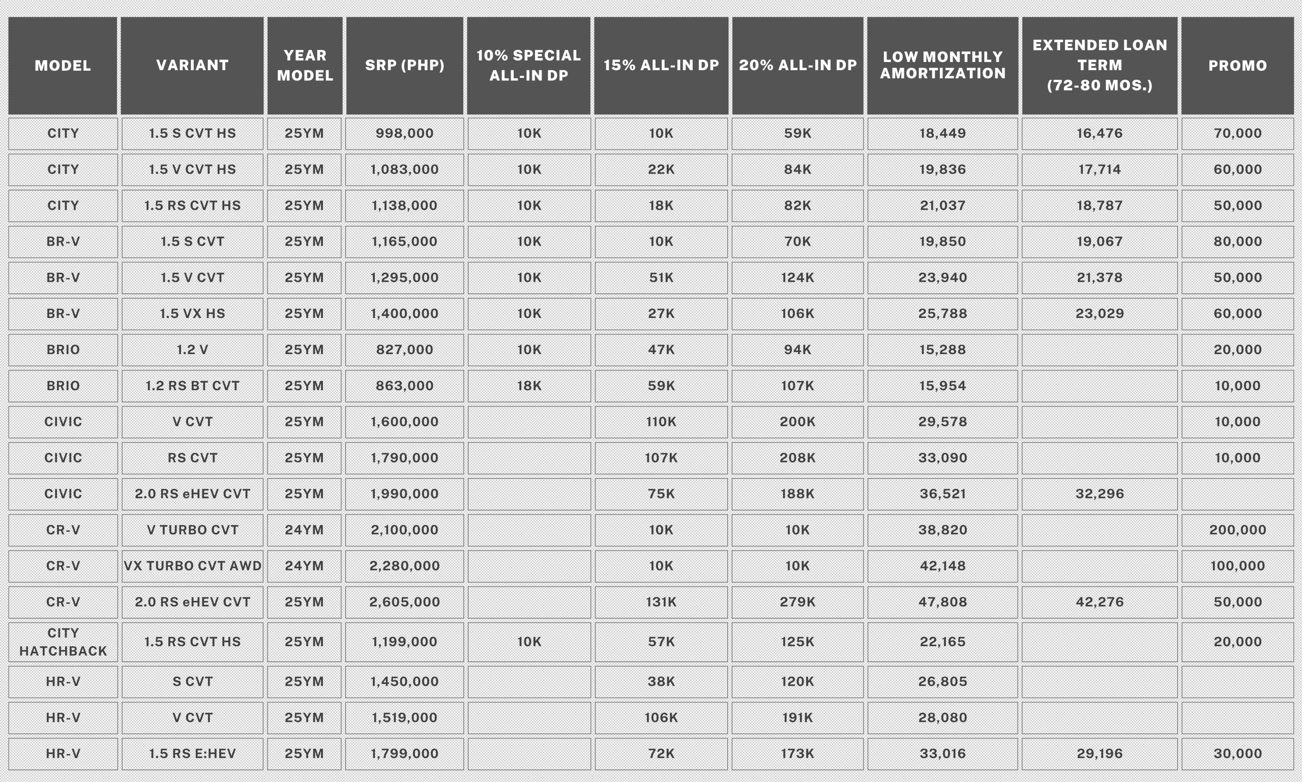 - Low Cash-out and Low Monthly Amortization All-In Bundle applicable for current e:HEV models: Customers are entitled to 15% or 20% downpayment with 60 months to pay. Fifteen Percent (15%) downpayment is not applicable to PSBank.