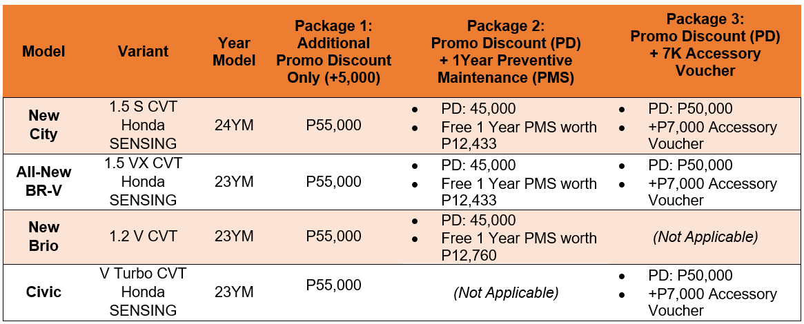 Honda customers yearning for a brand-new BR-V, New Brio, New City, and Civic could still choose at least one (1) promo package from the options thoughtfully arranged by Honda! In addition, customers can also get one (1) year Free Periodic Maintenance or an accessory voucher upon the release of the vehicle. Below is the table of packages available: