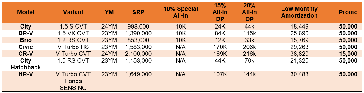 * The 10% Special All-In Downpayment is only applicable for the All-New BR-V, New Brio, and New City. * The 10% and 15% Downpayment are only applicable to BPI, RCBC, China Bank Savings, and Bank of Commerce for specific models and variants and subject to further bank approval.