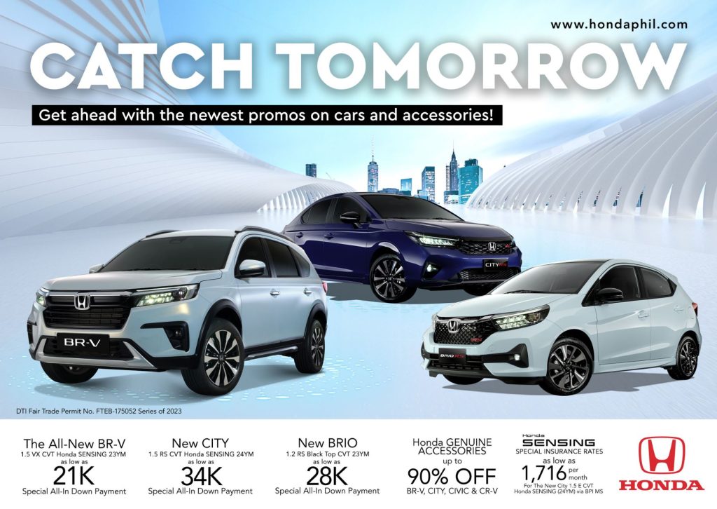 Honda Cars Philippines, Inc. (HCPI) is thrilled to kick off September with back-to-back deals exclusive through the “Catch Tomorrow” sales promo. From September 1 to 30, customers can enjoy awesome cash savings, flexible financing with as low as 10% down payment option, special insurance packages, and huge discounts on Honda Genuine Accessories for the New City, New Brio, and the BR-V!