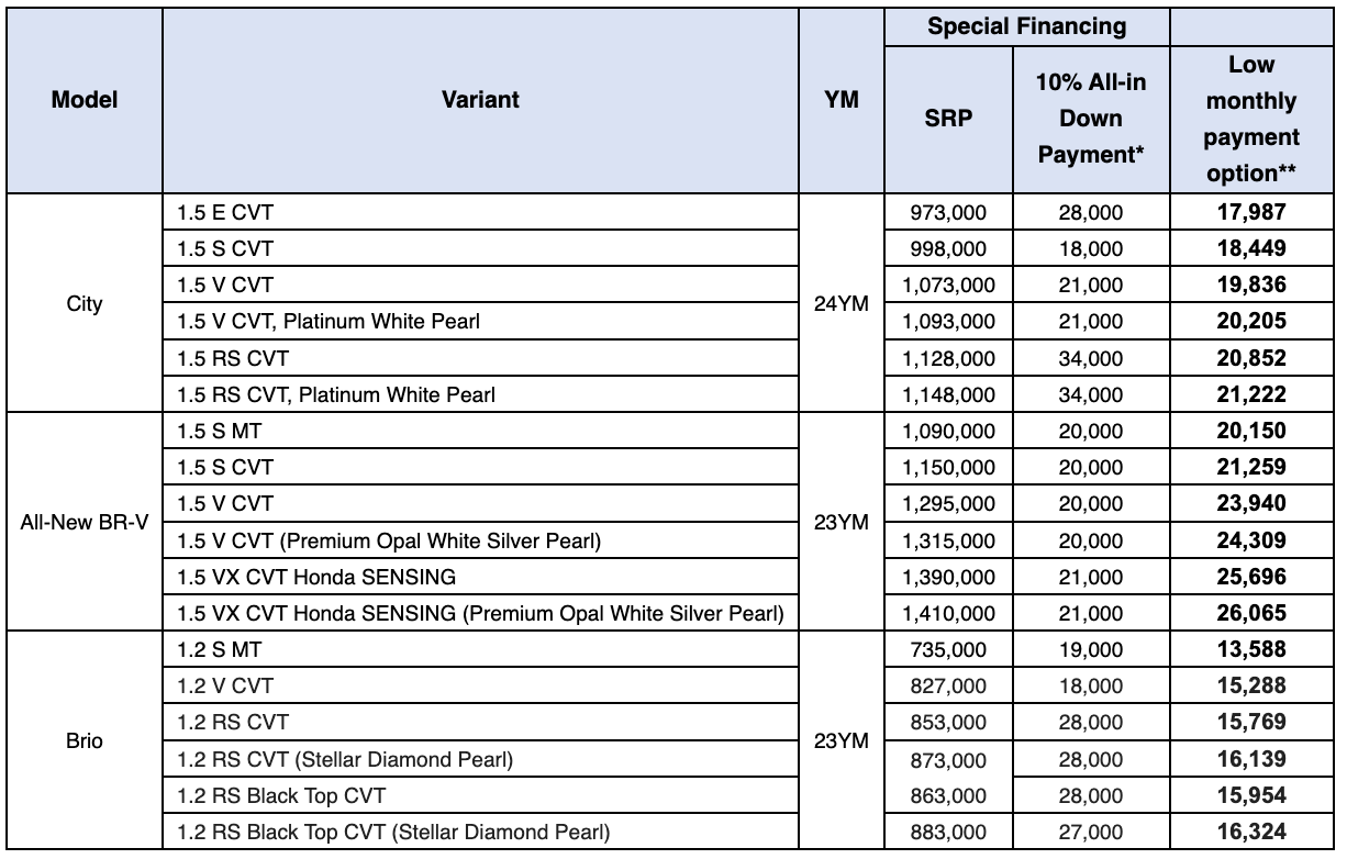 - *Special All-in Down Payment for All-New BR-V 1.5 VX CVT Honda SENSING 23YM