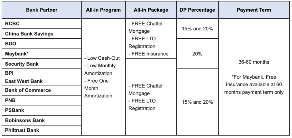 The Special All-in Program for customers going for BPI, China Bank Savings, and Bank of Commerce will receive an All-in Package of (1) Free Chattel Mortgage and (2) Free LTO Registration. Meanwhile, customers opting for RCBC will be receiving an All-in Package with (1) Free Chattel Mortgage, (2) Free LTO Registration, and (3) Free Insurance.