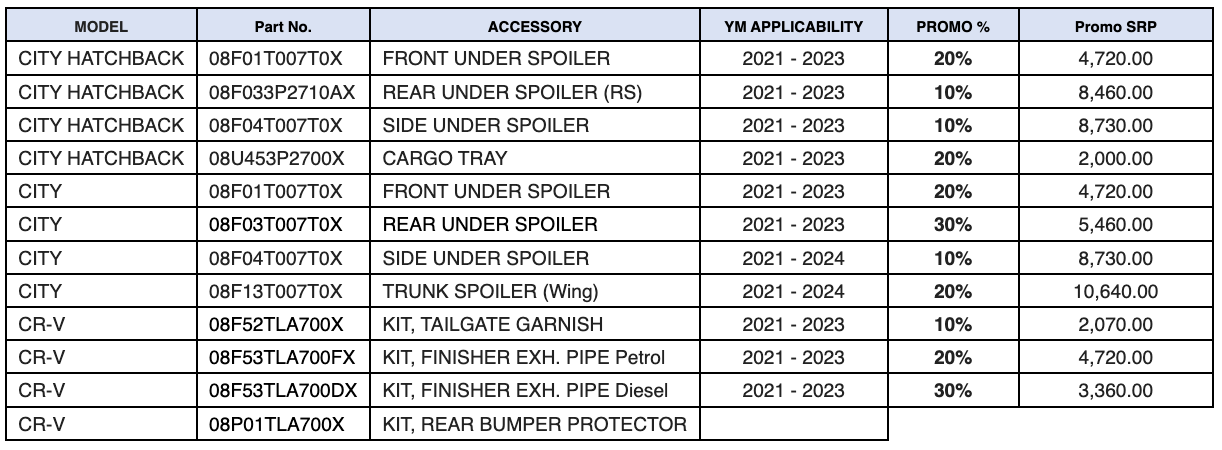 The following is the official list of available Honda Genuine Accessories for the City Hatchback, New City, CR-V, and BR-V with available promo discounts of up to 90%: