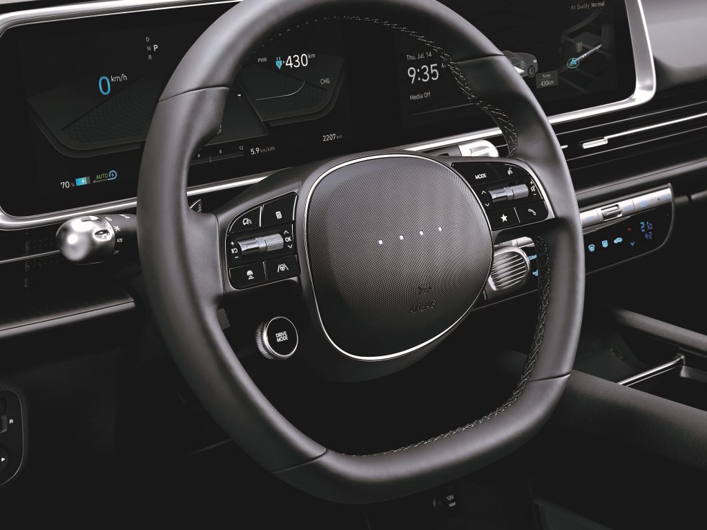 Instead of the usual Hyundai emblem, there are four LED pixel lights located at the steering wheel. These are complemented with line-lights at the dashboard that adapt depending on the movement being taken. Like when stepping out, going on reverse, changing drive modes, and the rest.