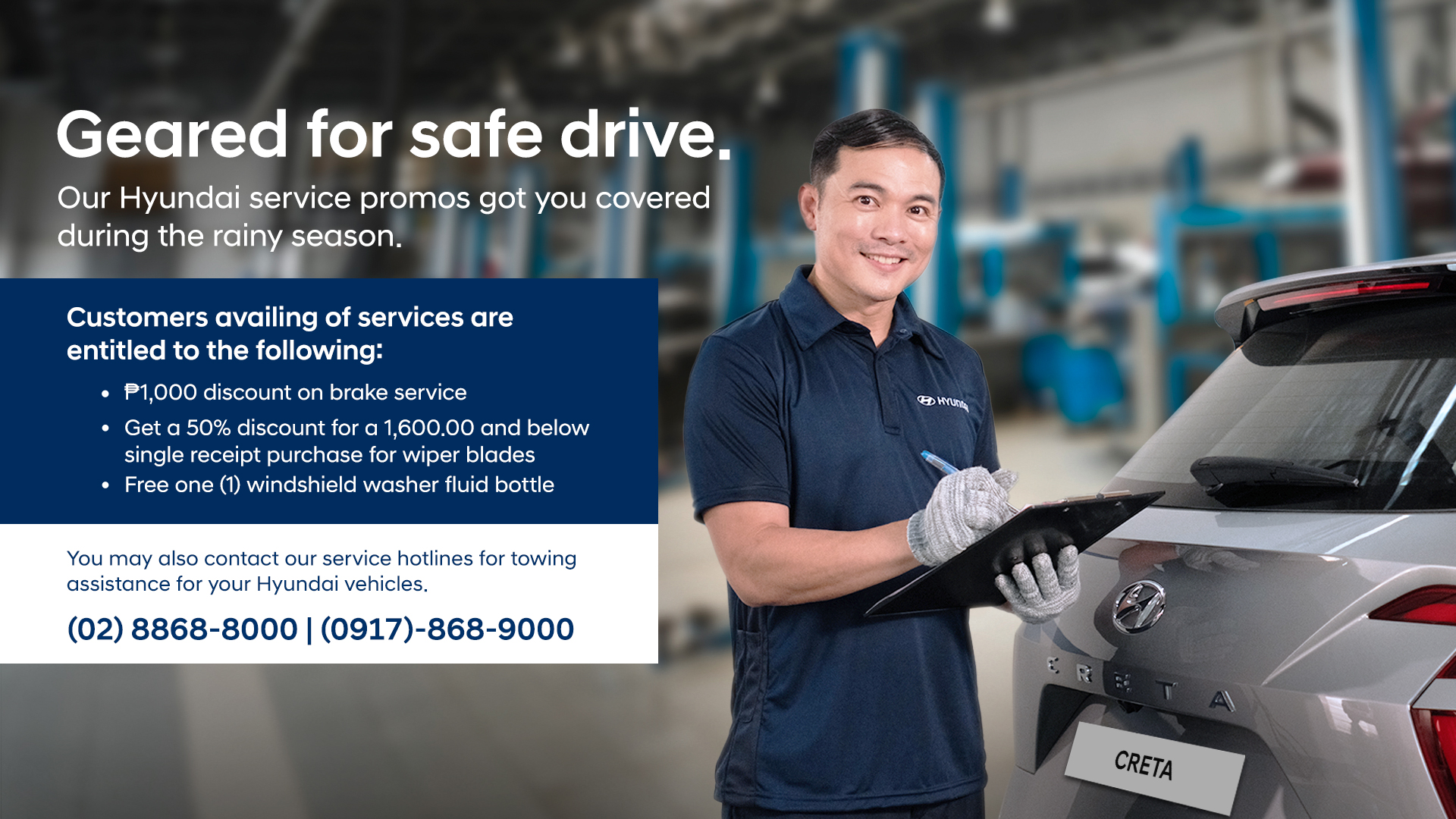 From August 1 to September 30, 2024, Hyundai owners can take advantage of the Geared for Safe Drive Promo. During this period, customers who bring their vehicles to any Hyundai dealership for service are entitled to a PhP 1,000.00 labor discount for brake check-ups. Additionally, customers can receive a 50% discount on wiper blades for purchases of PhP 1,600.00 and below, upon availing of any services.