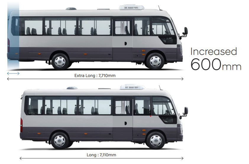 The Long Body edition at 7,110mm has a seating capacity of 29+1 with standard seats; the Extra-Long Body edition, which is 600mm longer at 7,710mm, has two available variants: 29+1 (with reclining seats) and 32+1 (with standard seats). It also stands taller at 2,870 mm to include the roof electric ventilator and condenser unit for the air conditioning.