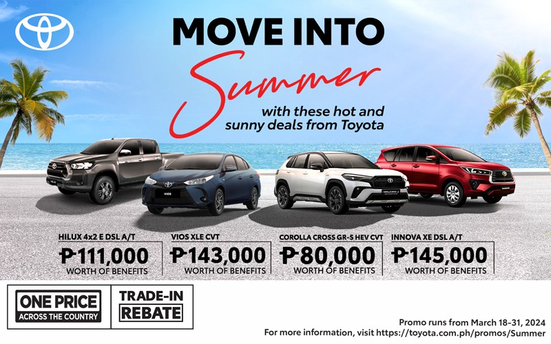 Drive into an exciting summer with Toyota! Promo runs from March 18 to 31, 2024 only. Check out the full mechanics, offers, and participating models here: https://toyota.com.ph/promos/Summer