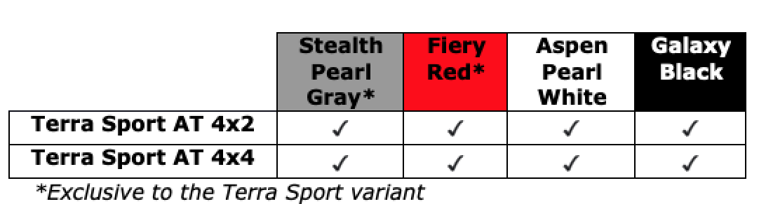 | Terra Sport 4×2 AT | Php 2,119,000 |