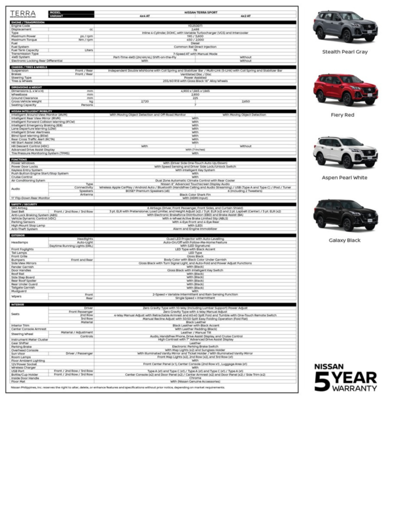 Along with the other variants of the Terra, the new Terra Sport also comes with Nissan’s class-leading 5-year warranty on parts and labor, giving customers security and peace-of-mind.