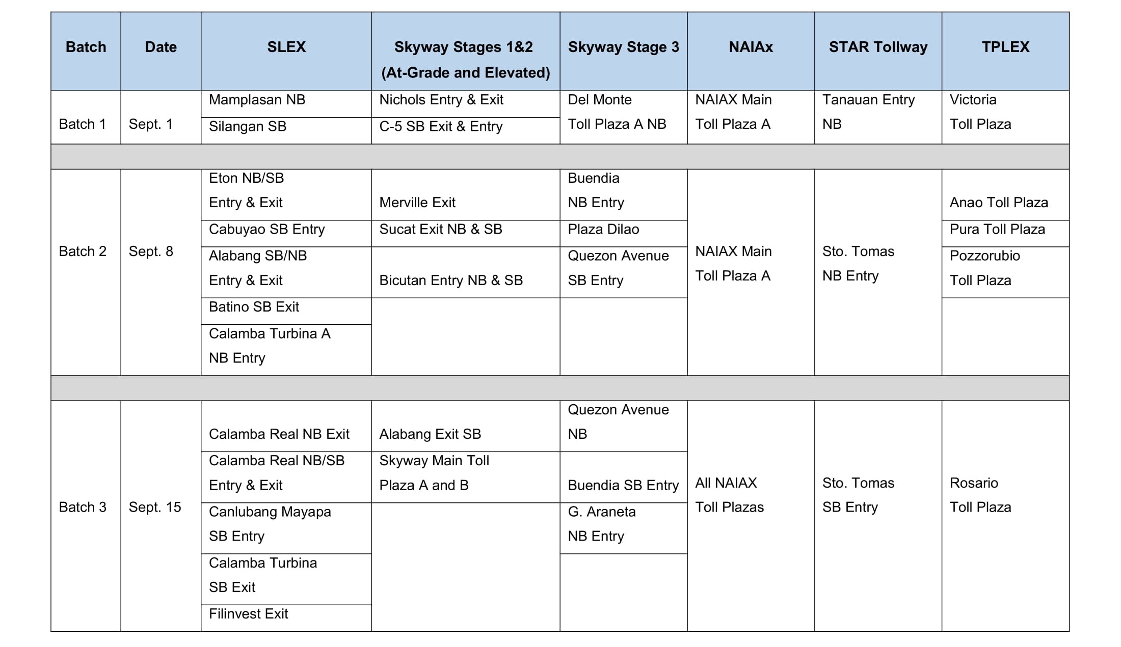 For the motorists’ guidance, the following toll plazas and exits at SMC tollways are covered by the cashless and contactless toll transaction program: