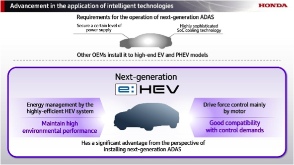 In the area of applying intelligent technologies, which will be the most critical competitive area of automobile business in the future, while focusing on independent development of next-generation ADAS as a key driving force, Honda will create new value from multiple aspects, while also leveraging collaboration with partners. With this core focus on the advancement of intelligent technology applications, Honda will strengthen its business foundation by reassessing its powertrain portfolio, such as EVs and HEVs.