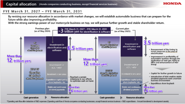Regarding the changes in capital allocation over the five-year period starting from the 2027 fiscal year, in light of the reduction in the resource investment amount, Honda will strive to generate more than 12 trillion yen in cash, combining its ability to generate cash stably from its motorcycle business and an increase in unit sales of HEV models. As for resource allocation through the 2031 fiscal year, while reducing EV-related investment by 3 trillion yen, Honda expects a minimal increase in investment related to HEV business. As for shareholder returns, Honda will maintain the previously announced target and strive for more than 1.6 trillion yen.
