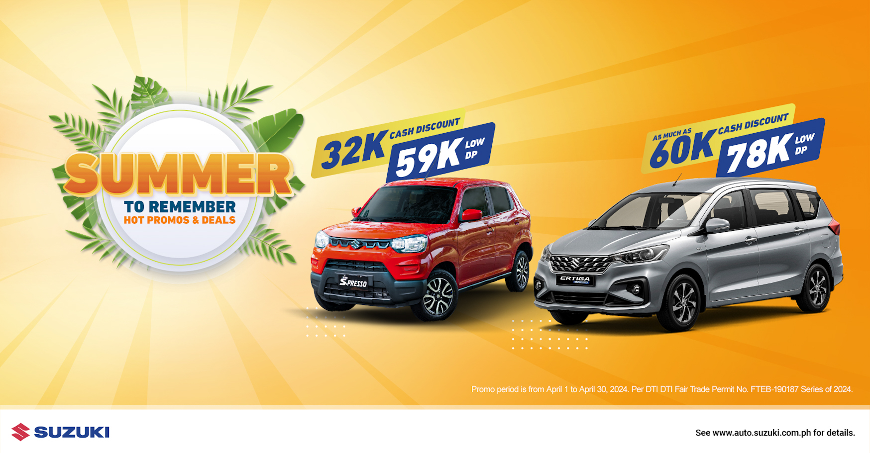 Suzuki Philippines has announced the extension of its “Summer to Remember Promo”. The Japanese brand says the promo is now valid for the whole month of April, and aims to highlight two of its popular models, the Ertiga Hybrid and S-Presso. Buyers of the new Ertiga Hybrid and S-Presso will enjoy promo perks like extended low down payment and huge cash discounts.