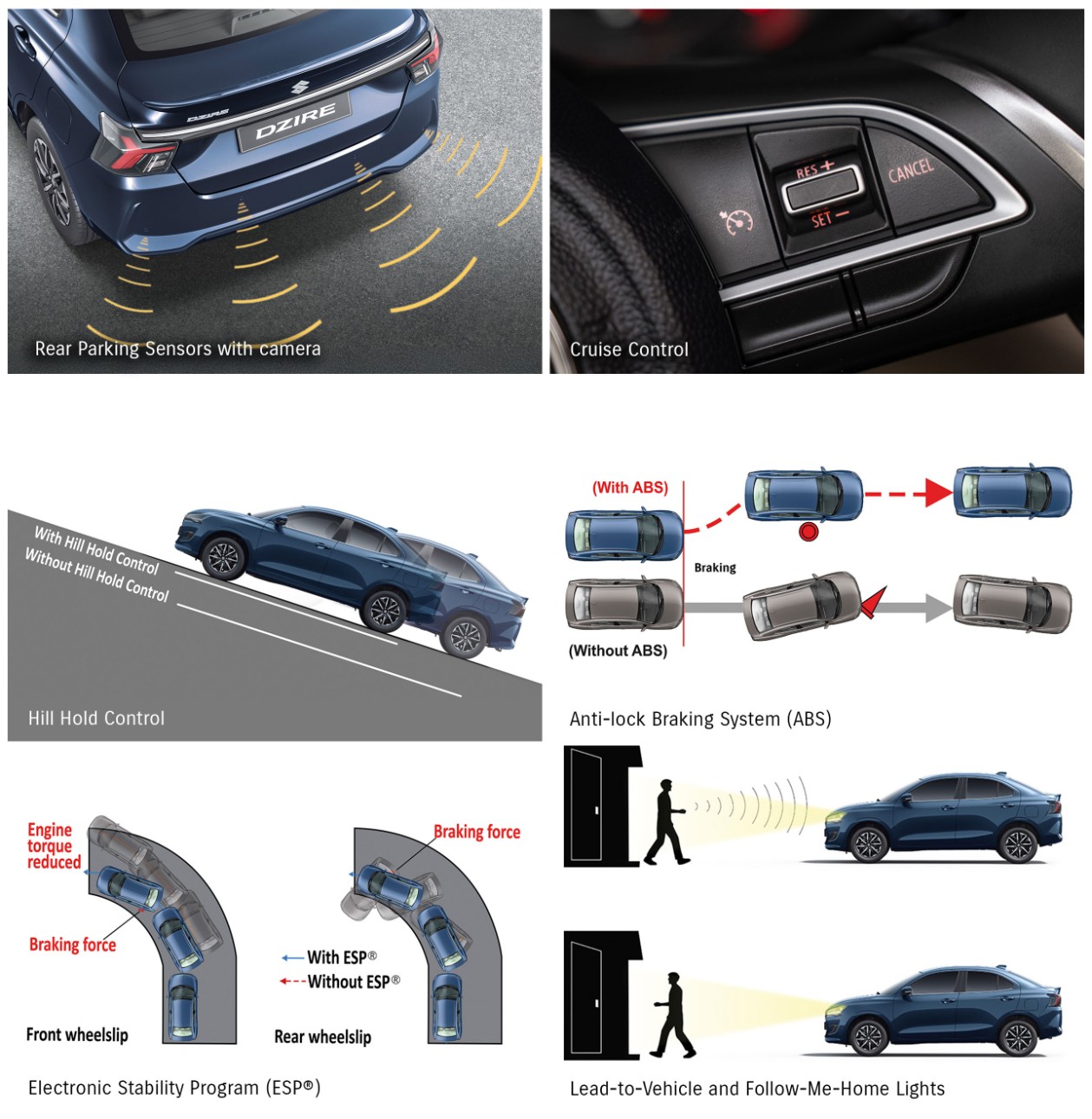 It also comes equipped with Electronic Stability Program (ESP), Anti-lock Braking System (ABS) with Electronic Brakeforce Distribution (EBD), Hill Hold Control, and rear parking sensors with a camera. Combined with its reinforced body structure, these advanced safety features have earned the Dzire a prestigious 5-Star Global NCAP Safety Rating for Adult Occupancy, offering confidence and peace of mind on every drive.