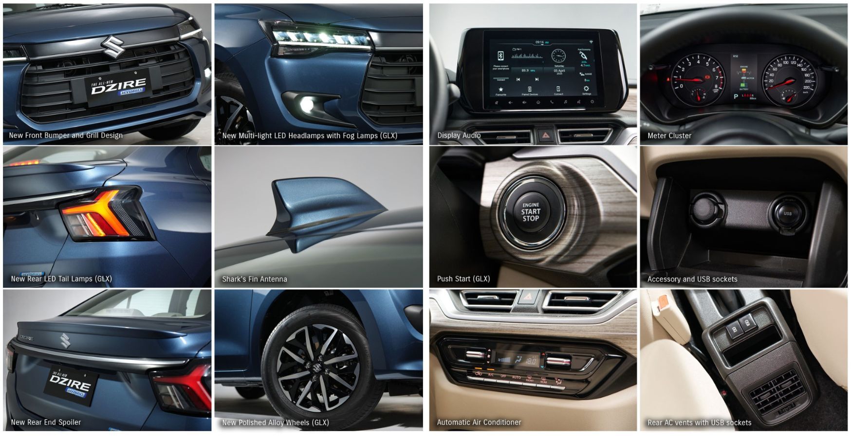 The All-New Dzire Hybrid showcases a more refined exterior with a redesigned front fascia, chrome-accented grille, and multi-light LED headlamps. Its sleek silhouette and sculpted body lines flow seamlessly into its new rear combination lamps, giving it a bold and elegant presence on the road. Inside, the Dzire features a spacious cabin with a premium, dual-tone interior accents, improved ergonomics, and a driver-centric dashboard layout.