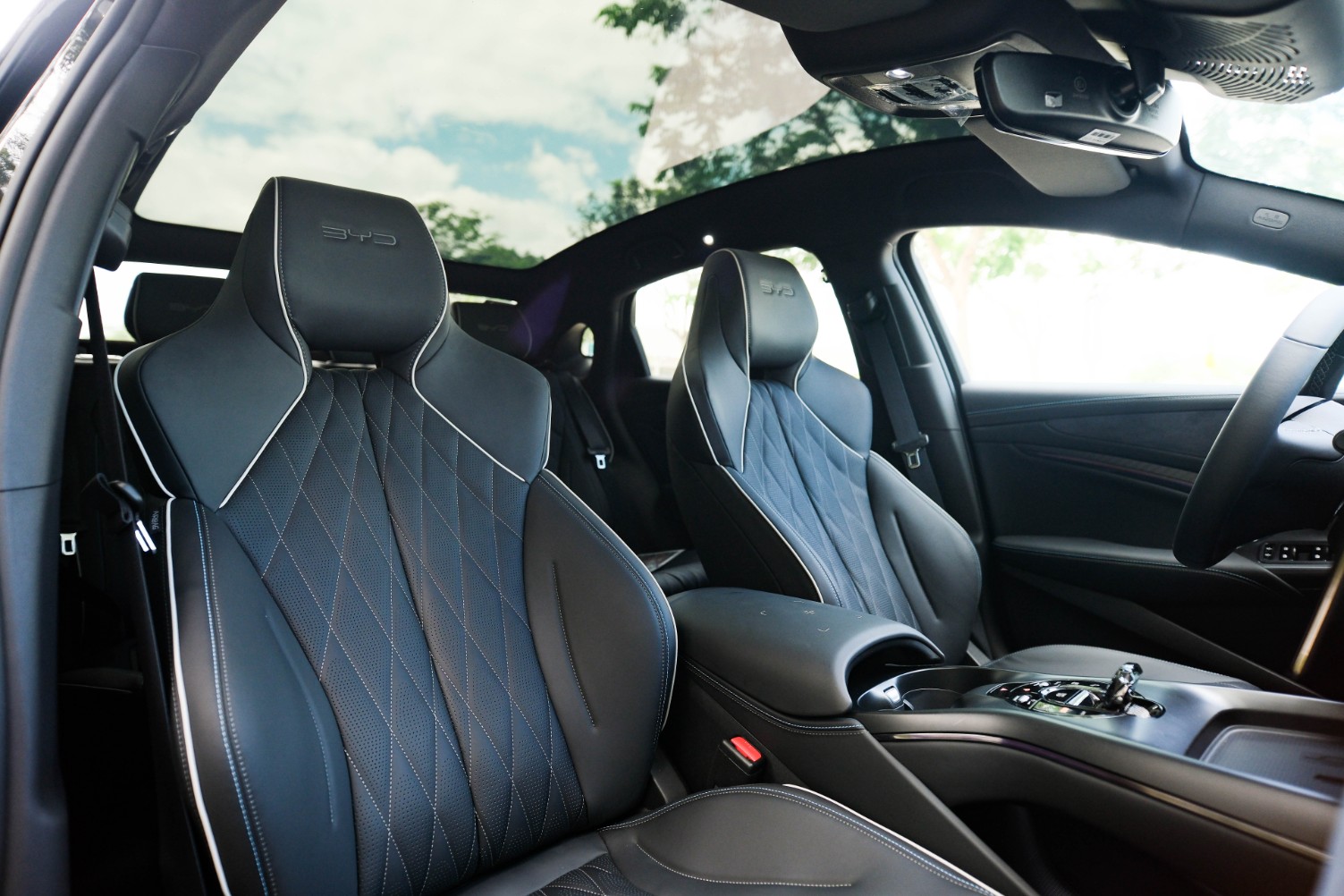 Inside, the BYD Seal features a sleek cabin with a sophisticated black colorway and race-inspired suede accents. The interior exudes a premium feel with power-adjustable integrated sports seats that are luxuriously upholstered in leather and offer ventilation, heating, and a driver seat memory function. A panoramic glass roof adds natural light to the cabin, enhancing the overall ambiance and perception of space.
