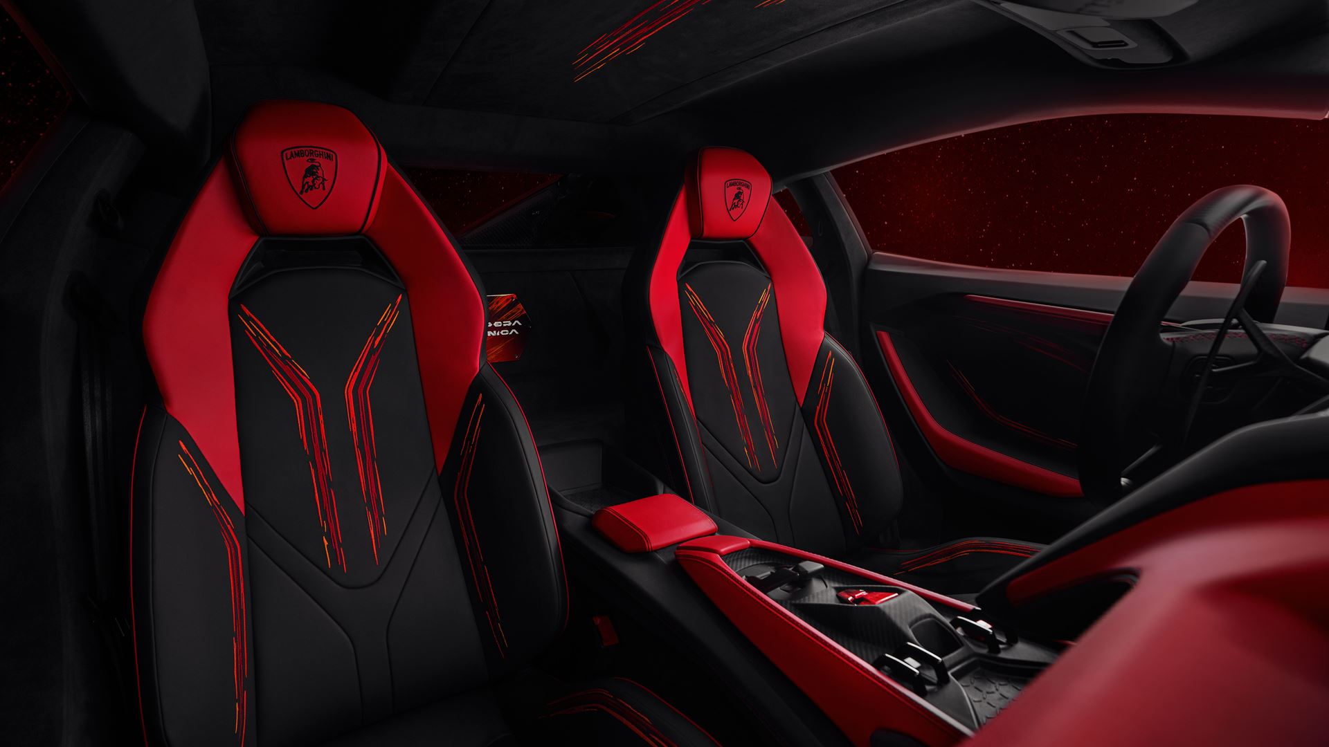 Inside, the cabin is a sophisticated blend of Nero Ade leather, accented by Rosso Efesto details. The interior features precise craftsmanship, including 53 additional hours for the inverted stitching and piping that emphasize the Lamborghini logo. A combination of unicolor leather and Corsatex by Dinamica, accented with contrast stitching, elevates the interior’s elegance. The finishing touch is the exclusive Opera Unica plate, crafted from carbon fiber, and etched with Bianco Monocerus lettering to complete the design.