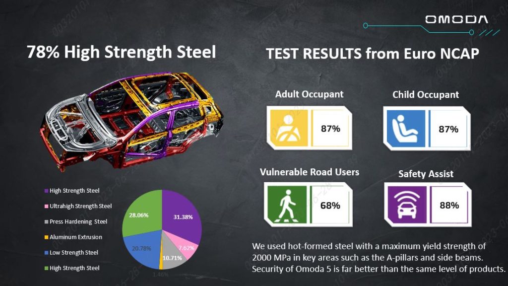 The OMODA 5’s body consists of high-strength steel as the main structure, with steel accounting for 78%. It can withstand pressures of up to 1800Mpa. Equipped with the above ultra-high strength materials, the cage body has been designed and manufactured to maintain its overall structure without deformation in case of a collision. As for the cabin, the OMODA 5 is equipped with 7 airbags – including the driver and passenger seats, side airbag, side curtain and middle airbag, which can provide all-round safety protection for occupants in the event of a collision.