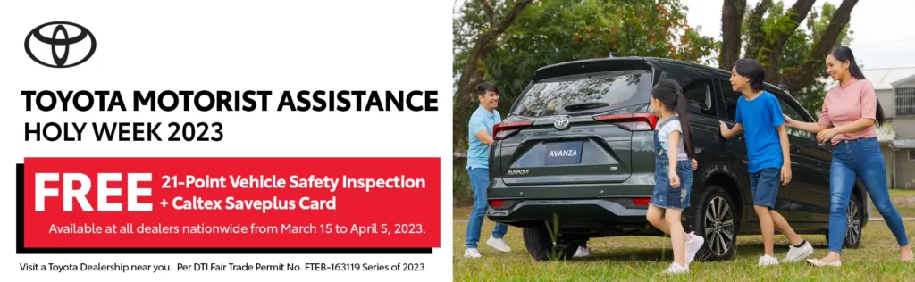 The free Vehicle Safety Inspection promo runs from March 15 to April 5, 2023. For more information, visit https://toyota.com.ph/promos/pre-holy-week-032023