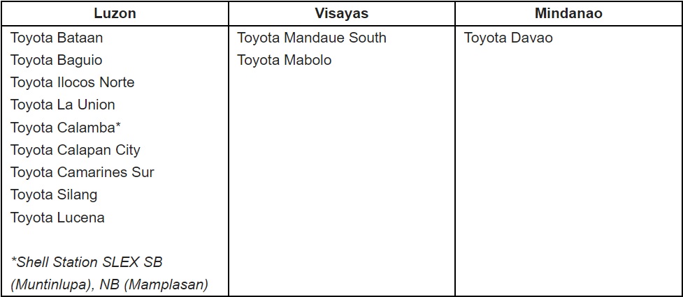 Motorists can avail of a free 21-point Vehicle Safety Inspection at any authorized Toyota Dealer and Service Center (excluding Body & Paint Centers) nationwide until April 5. Toyota owners can set an appointment by contacting their preferred dealer or service center. To find a dealer or service center near them, they can go to toyota.com.ph/dealer.