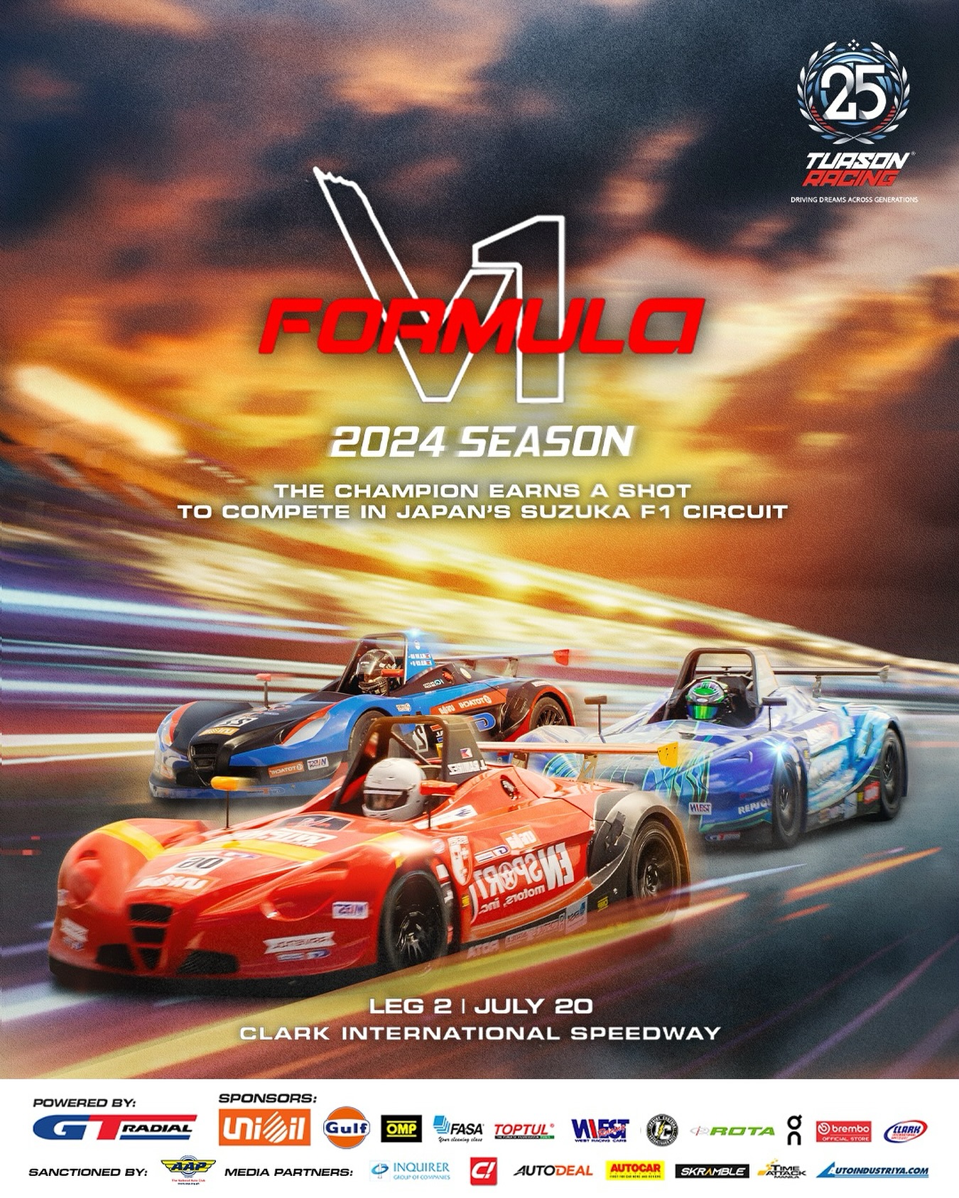 The Formula V1 Challenge and 1NZ Unity Cup is presented by Tuason Racing & GT Radial, powered by Unioil and Gulf, and supported by OMP, Rota, FASA, Toptul, DynoPro, On Shoes, Imprint Customs, AAP, and Clark International Speedway. Together with its media partners, C! Magazine, Autodeal, Autocar, Time Attack Manila, Inquirer, Autoindustriya, and Skramble.