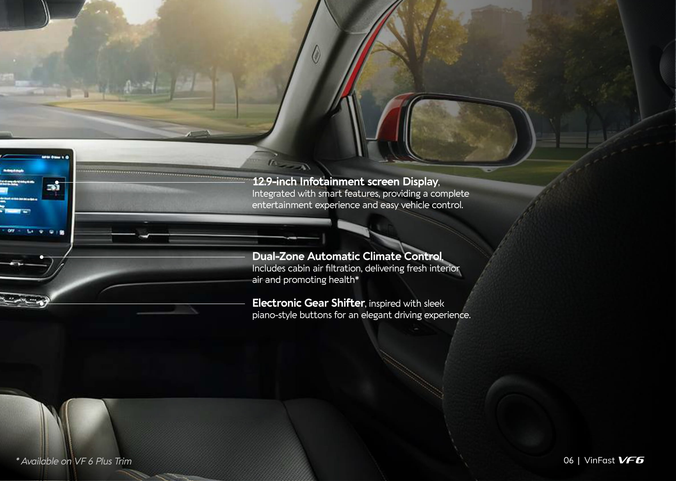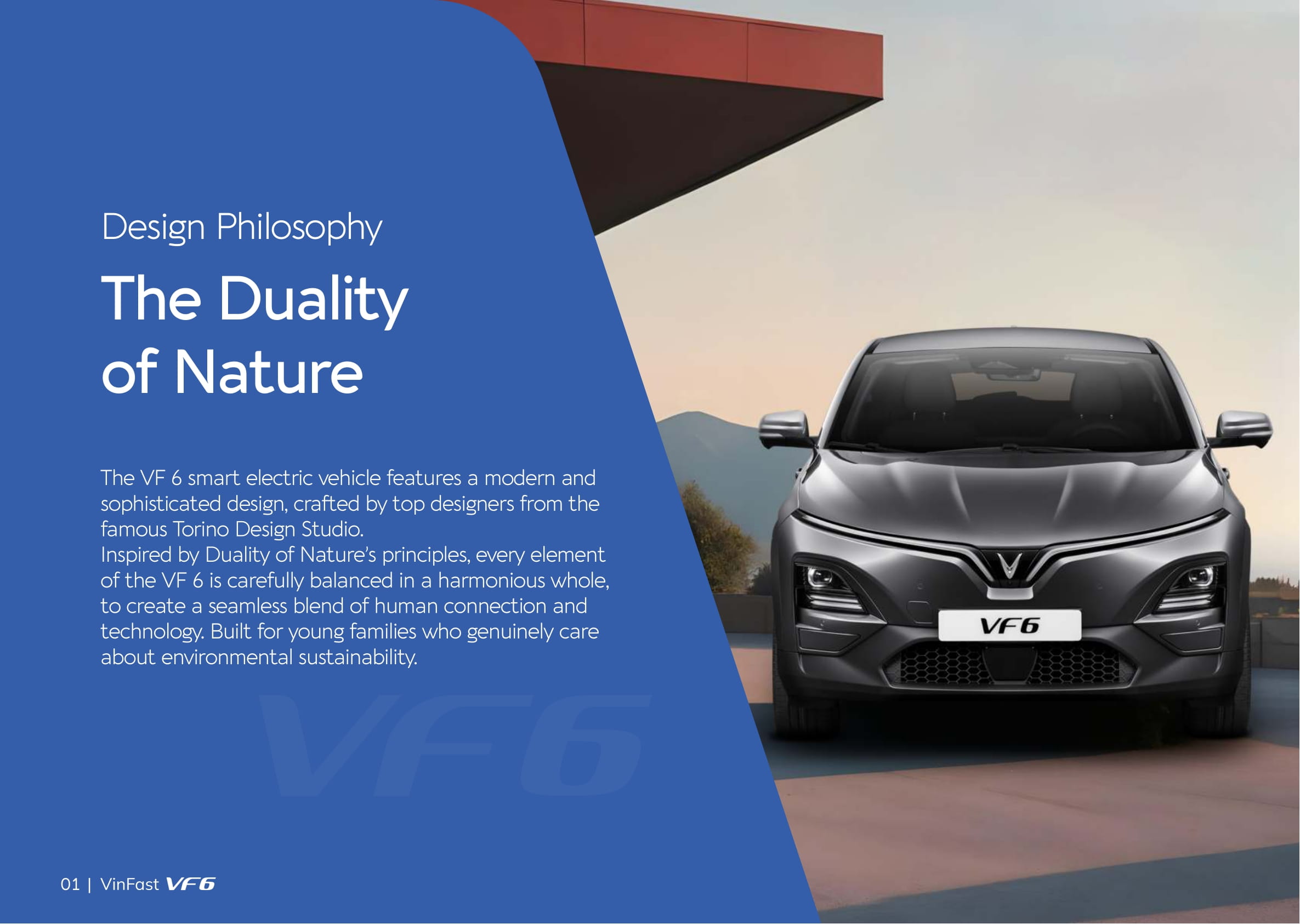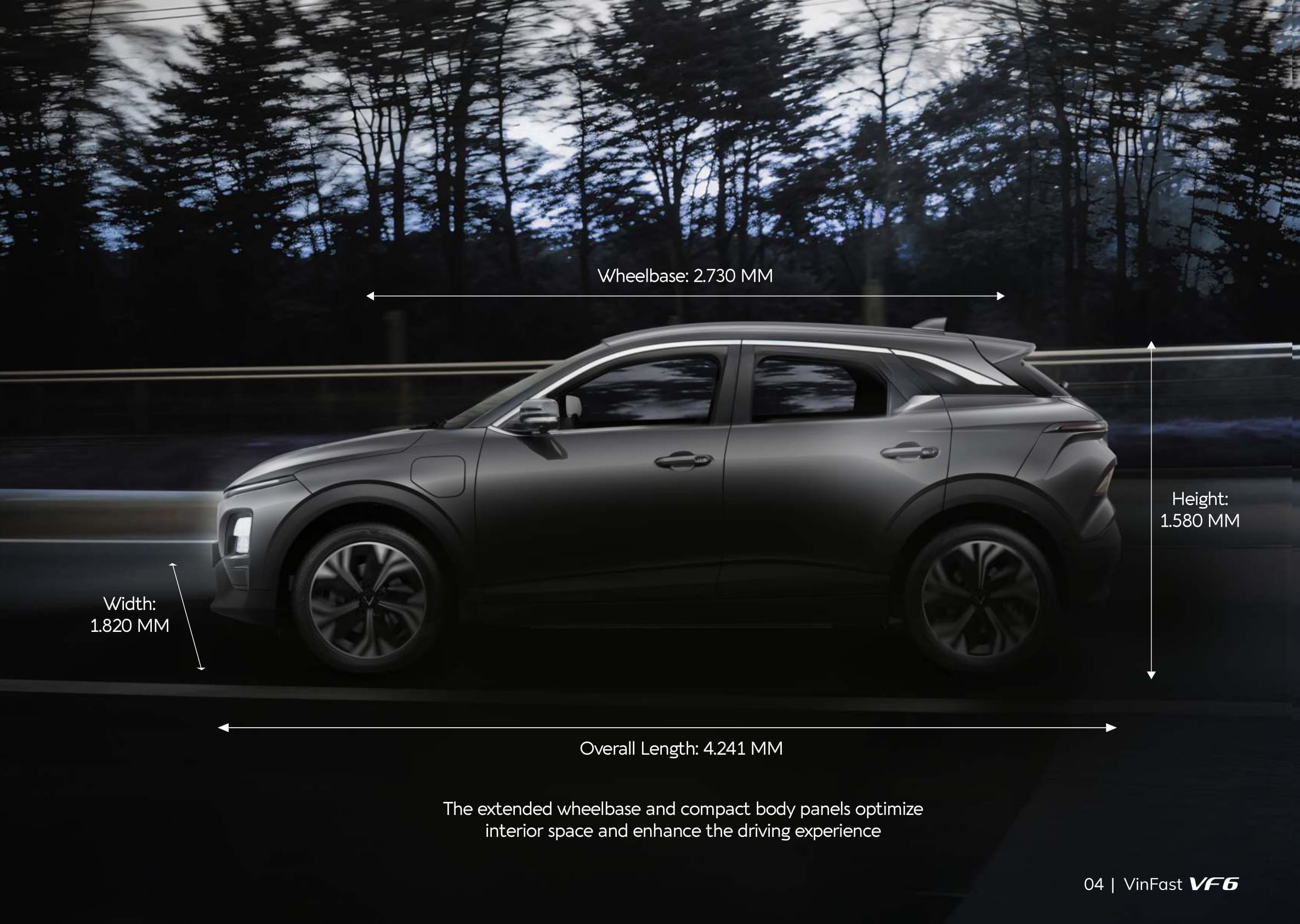 Developed in collaboration with the renowned studio Torino Design, the VF 6 features a modern design inspired by the concept of “The Duality in Nature.” This unique style reflects the vehicle’s own spirit and personality, while seamlessly blending with VinFast’s distinctive and unmistakable design language. Its overall dimensions (length x width x height) are 4,241 x 1,834 x 1,580 mm, with a wheelbase of 2,730 mm. Thanks to the advantages of EV architecture, this B-segment vehicle offers an interior space comparable to many C-segment gasoline models.