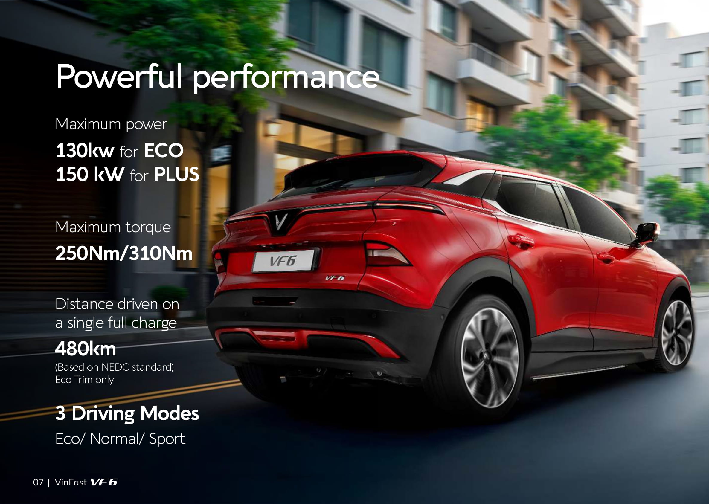 The VF 6 is equipped with a powerful electric motor delivering up to 150 kW and torque of 250 Nm (Eco) or 310 Nm (Plus). With a range of up to 480 km per full charge (NEDC standard), the VF 6 is well suited for the dynamic needs of modern families. It also includes 20 advanced driver-assistance system (ADAS) features and eight airbags, offering added peace of mind, especially for families with young children.