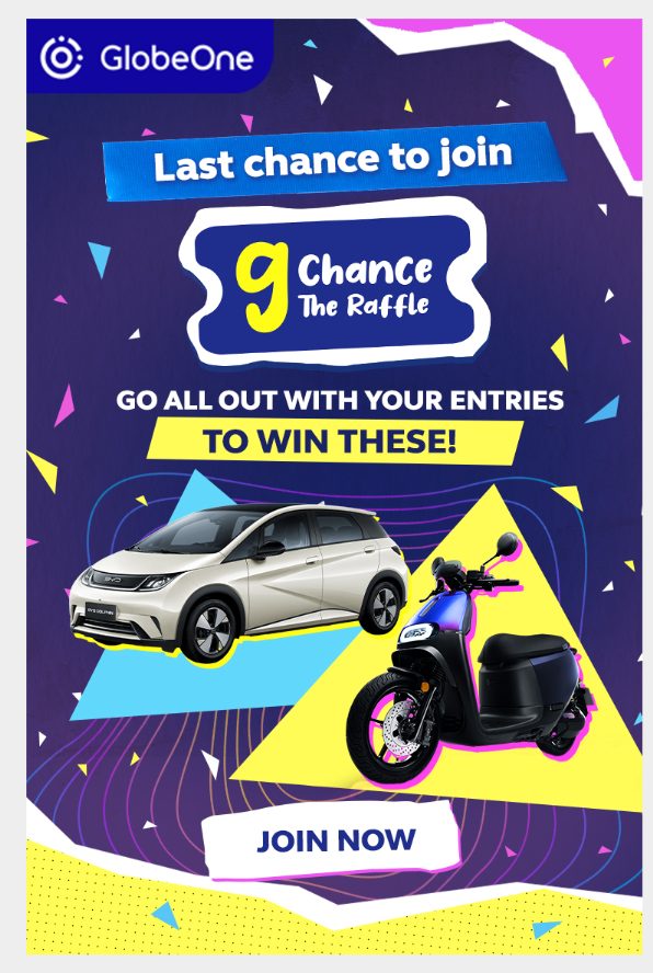 “Our G Chance the Raffle brings together excitement and advocacy as we debut these e-vehicles as prizes for our loyal customers. This is a rare and life-changing opportunity for them to own vehicles of the future today and a whole new way for us to make dreams happen,” said Jerome Patalud, Head of Globe Rewards.